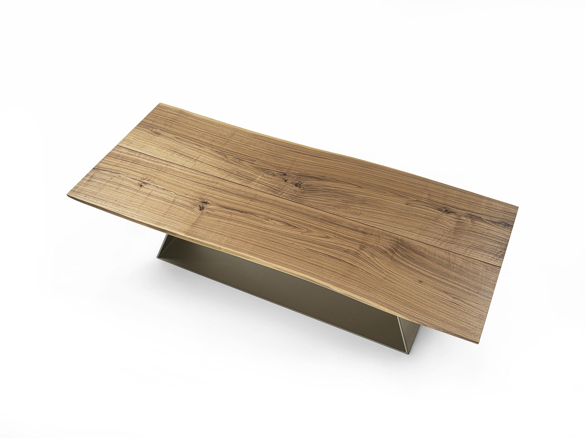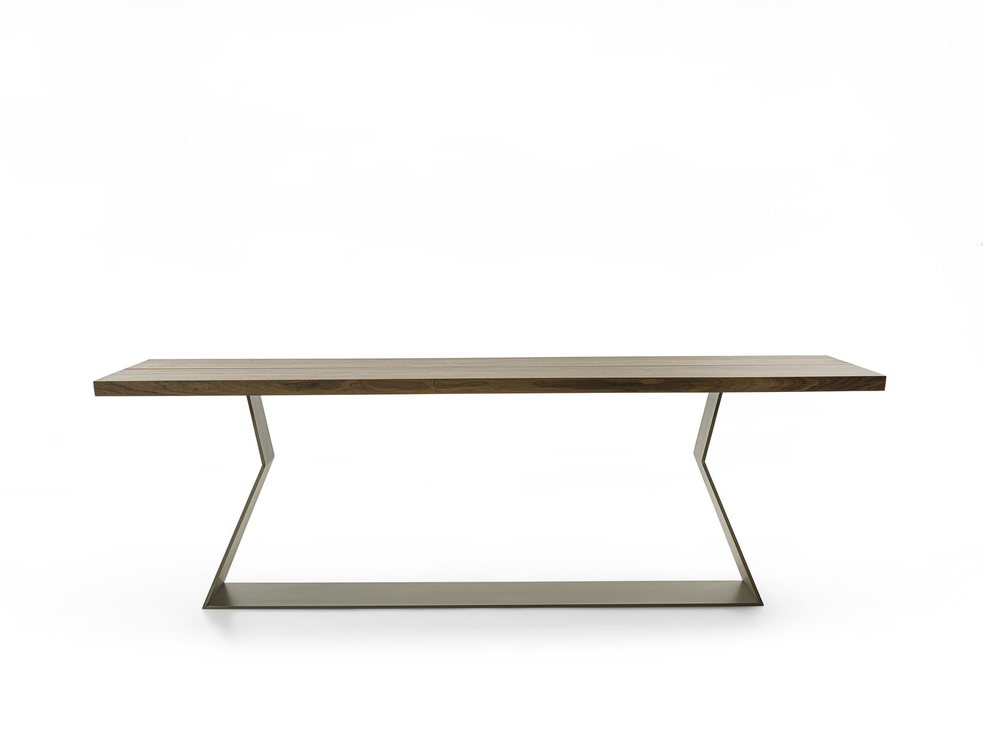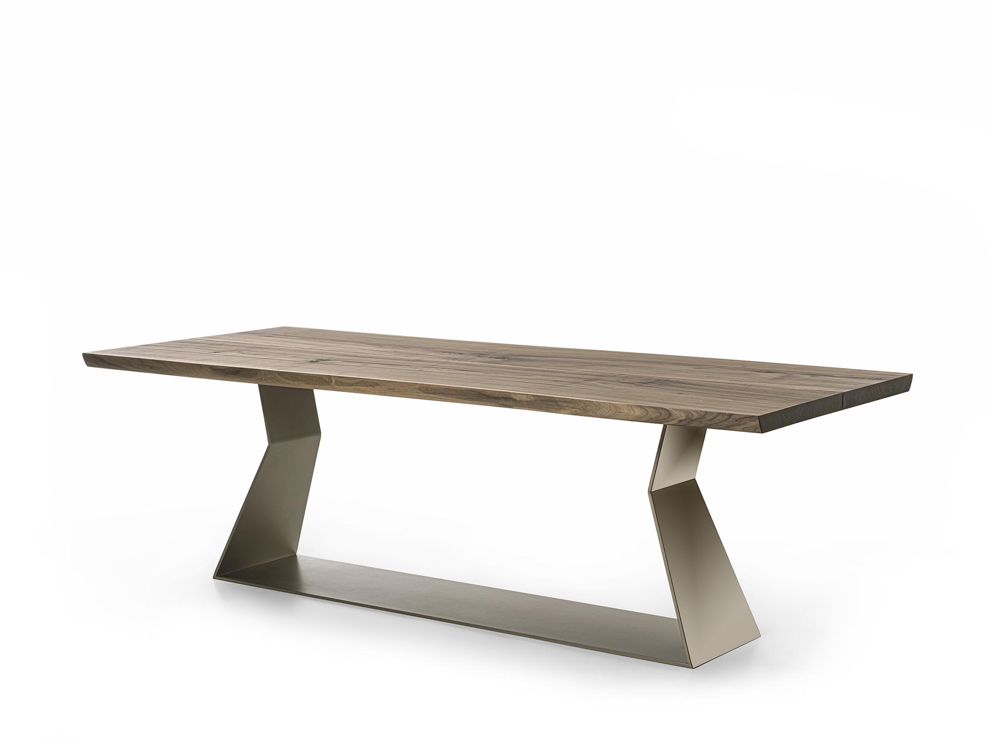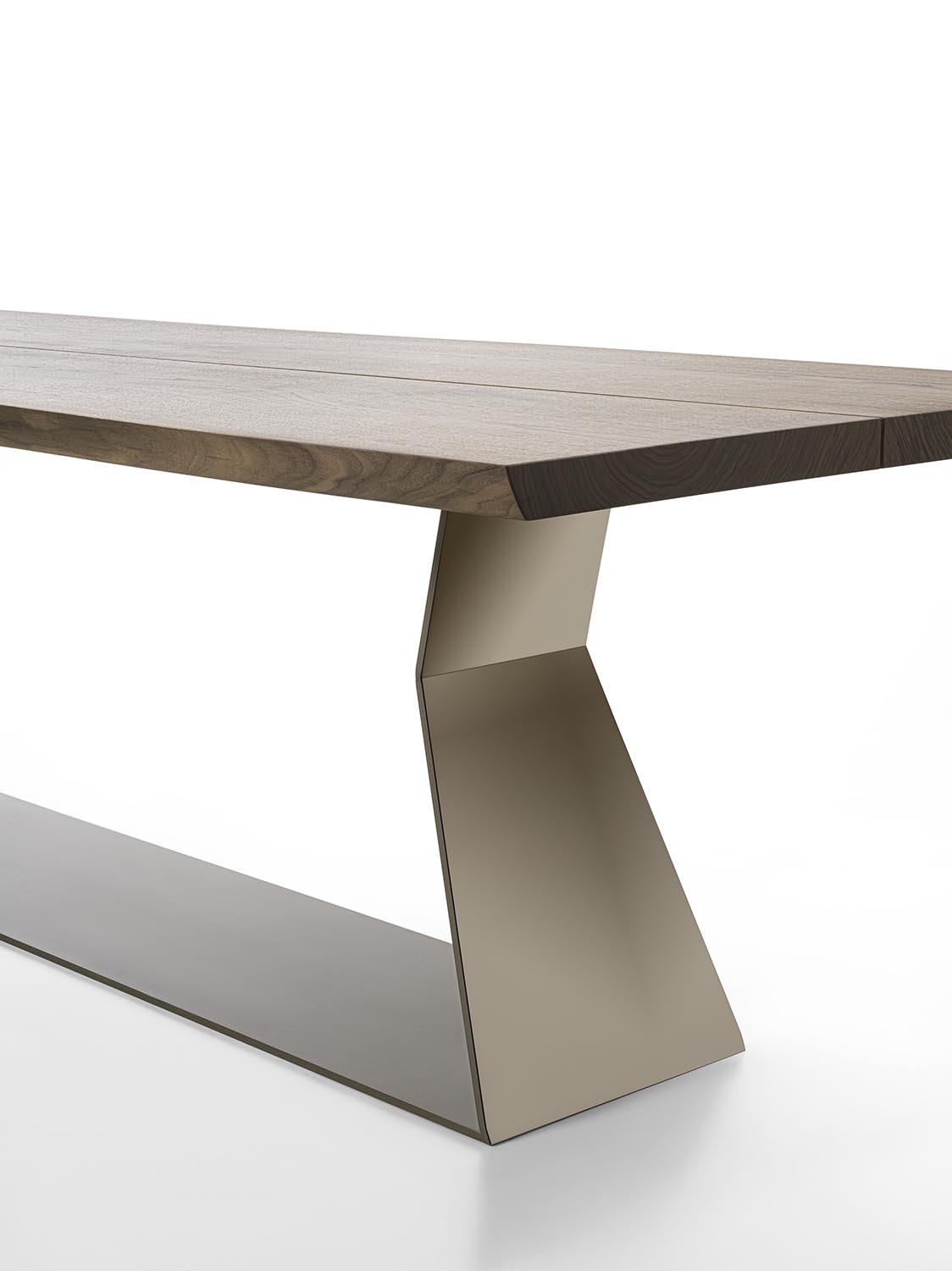 经典BEDROCK餐桌的“100+6”重新演绎版本,实木桌面由两块独一无二的木板对齐拼接而成,中间留有一道接缝,并保留自然边缘。底座采用几何造型铁板制成;外部覆以亮面钢材,内部则呈现青铜效果饰面。