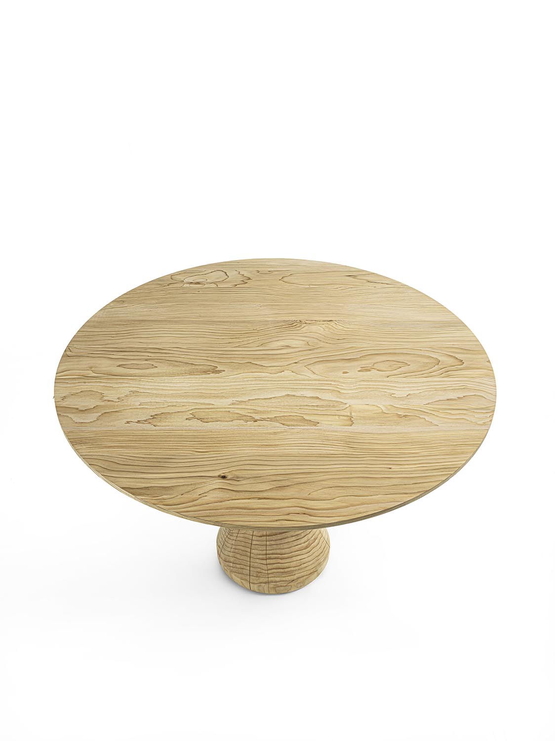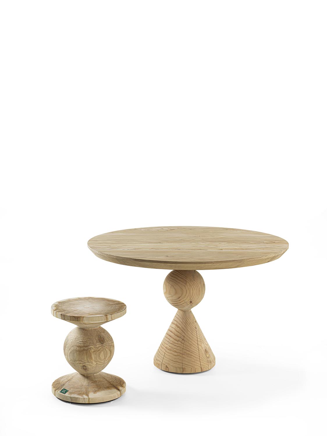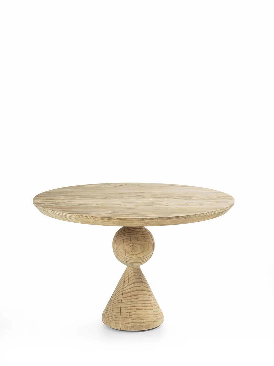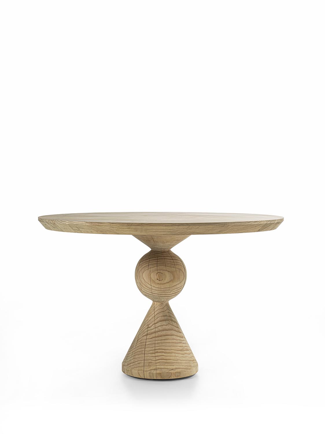 桌子配有由胶合木条制成的雪松实木桌面。底座同样采用整块雪松实木制成,由底部一个修长的圆锥、一个中央球体以及桌面下方的一个扁圆锥组成,由此形成对比交错的视觉效果,塑造出兼具强烈材质感与造型感的雕塑式支撑。