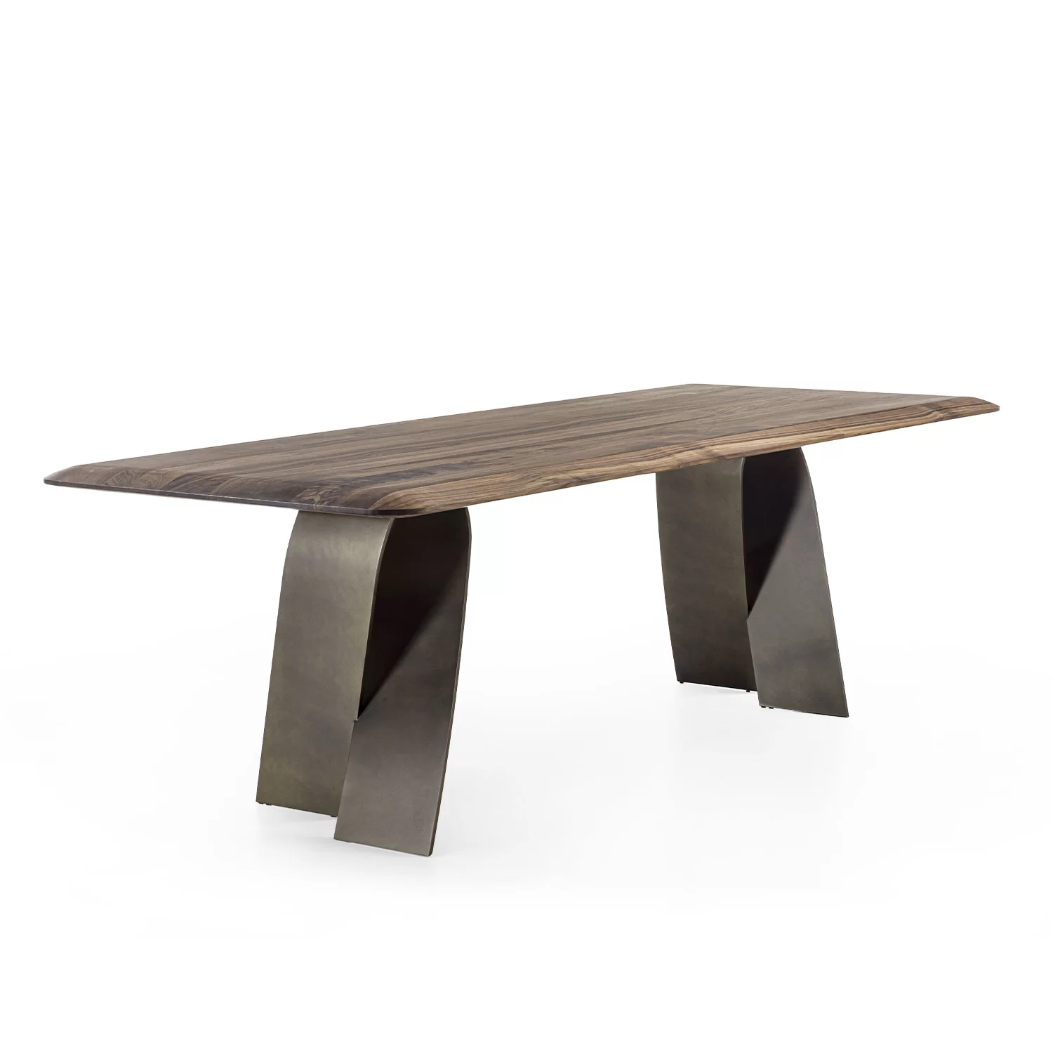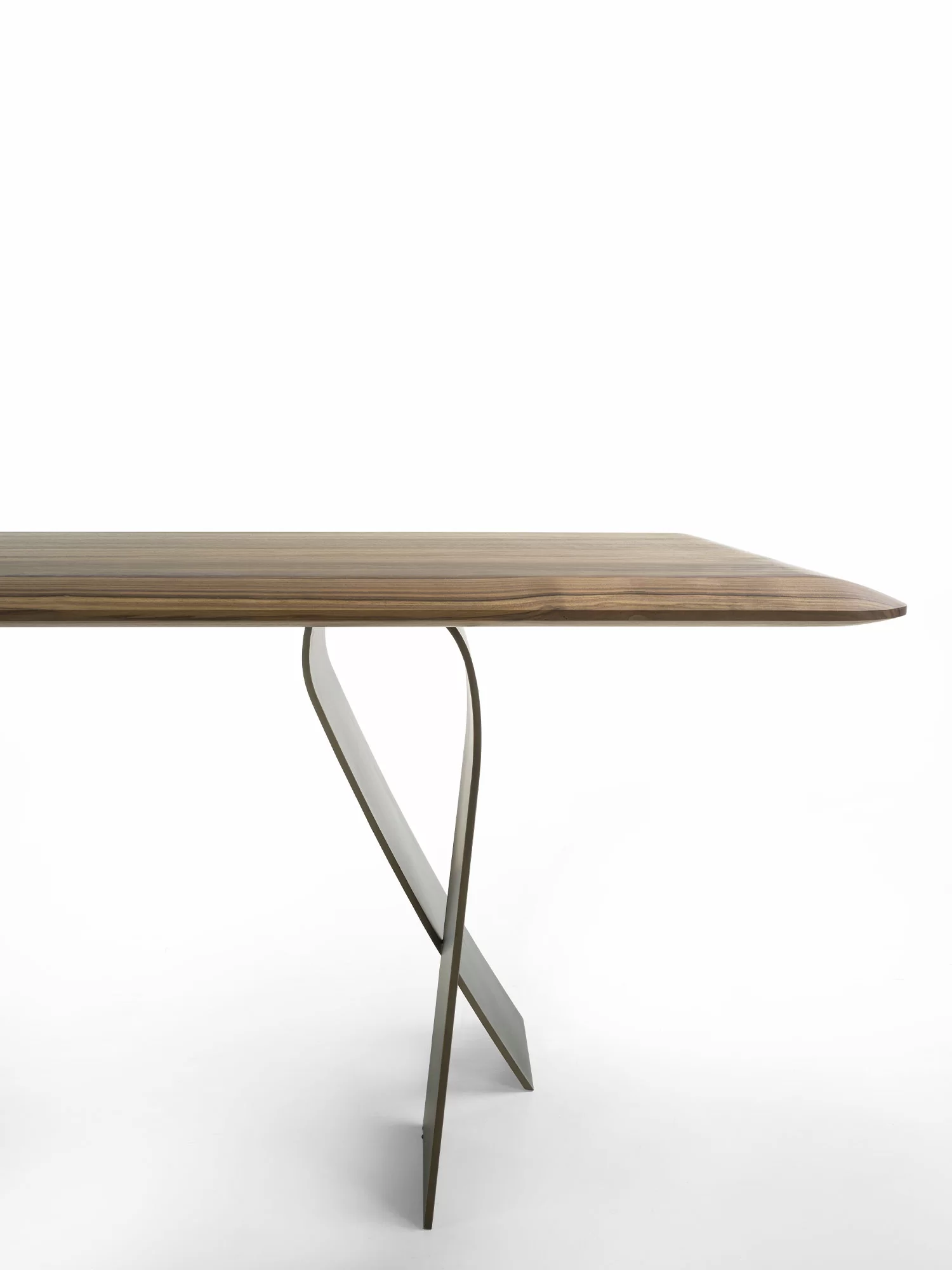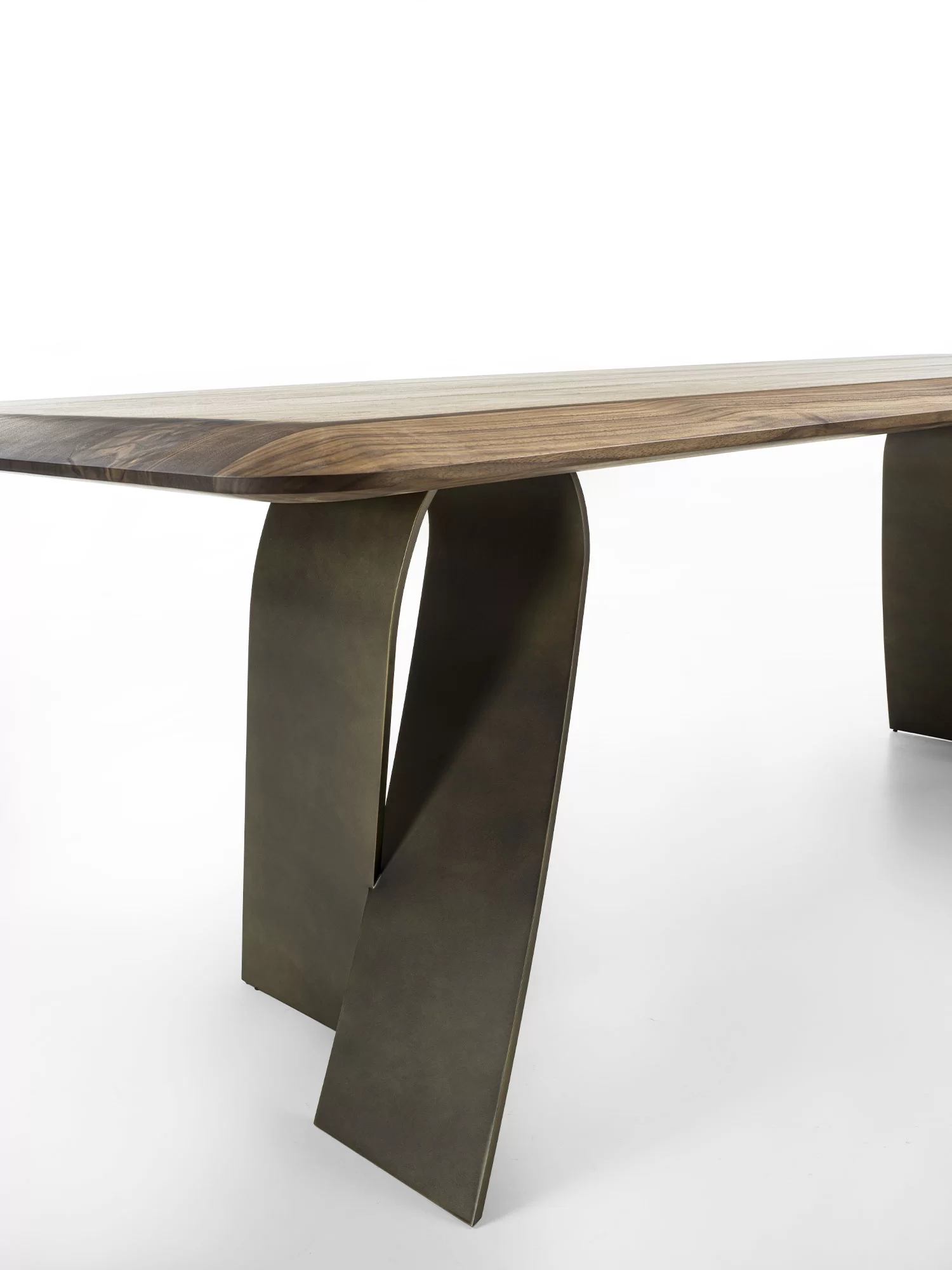 这款桌子配备了粘合木条制成的原木顶部。其特点是由于倾斜且圆润的边缘形成的纤薄感,这使得它具有轻盈而流畅的设计。与此同时,搭配蜿蜒的铁制腿部,使人联想到飘逸的丝带。