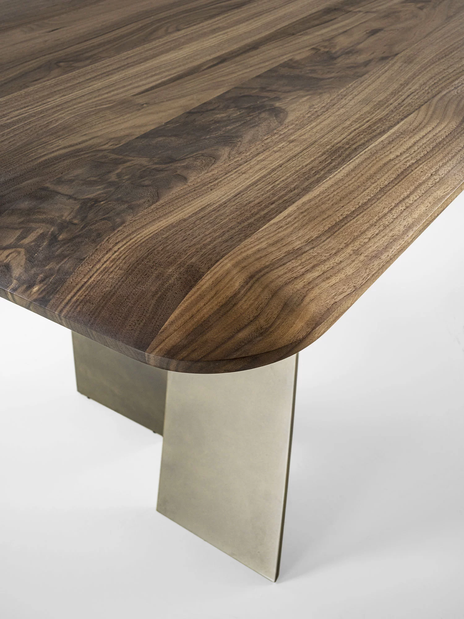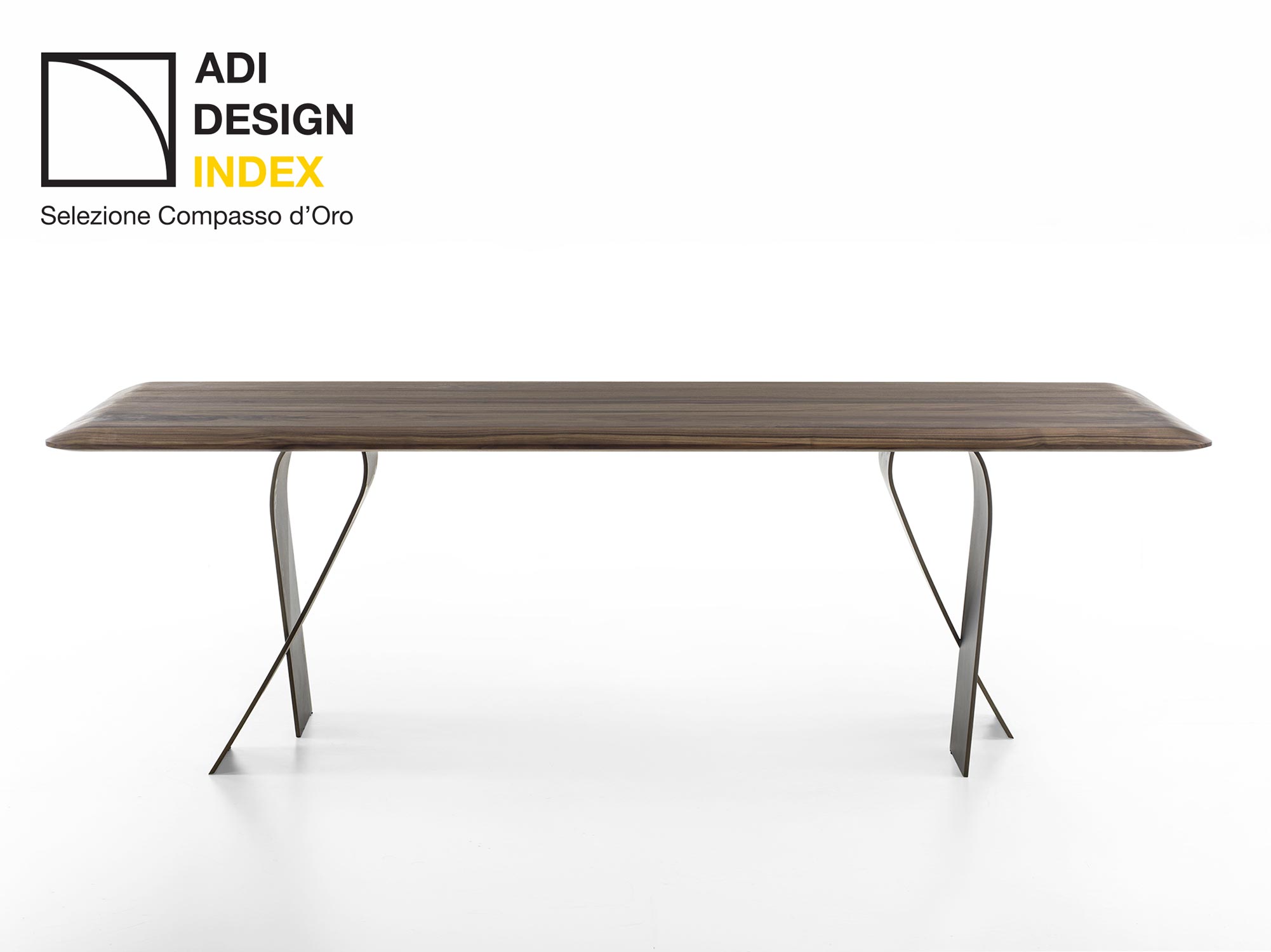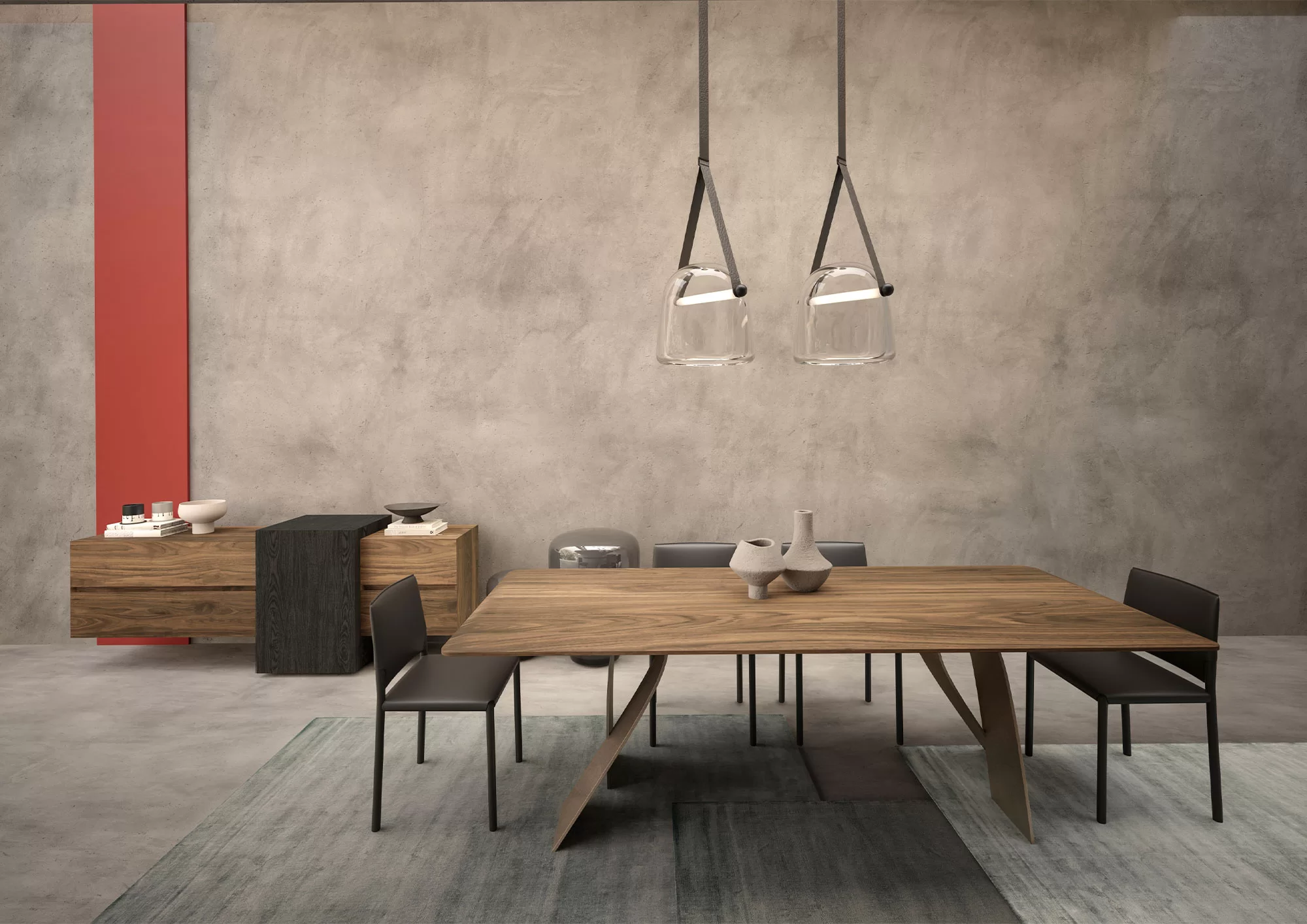 这款桌子配备了粘合木条制成的原木顶部。其特点是由于倾斜且圆润的边缘形成的纤薄感,这使得它具有轻盈而流畅的设计。与此同时,搭配蜿蜒的铁制腿部,使人联想到飘逸的丝带。
