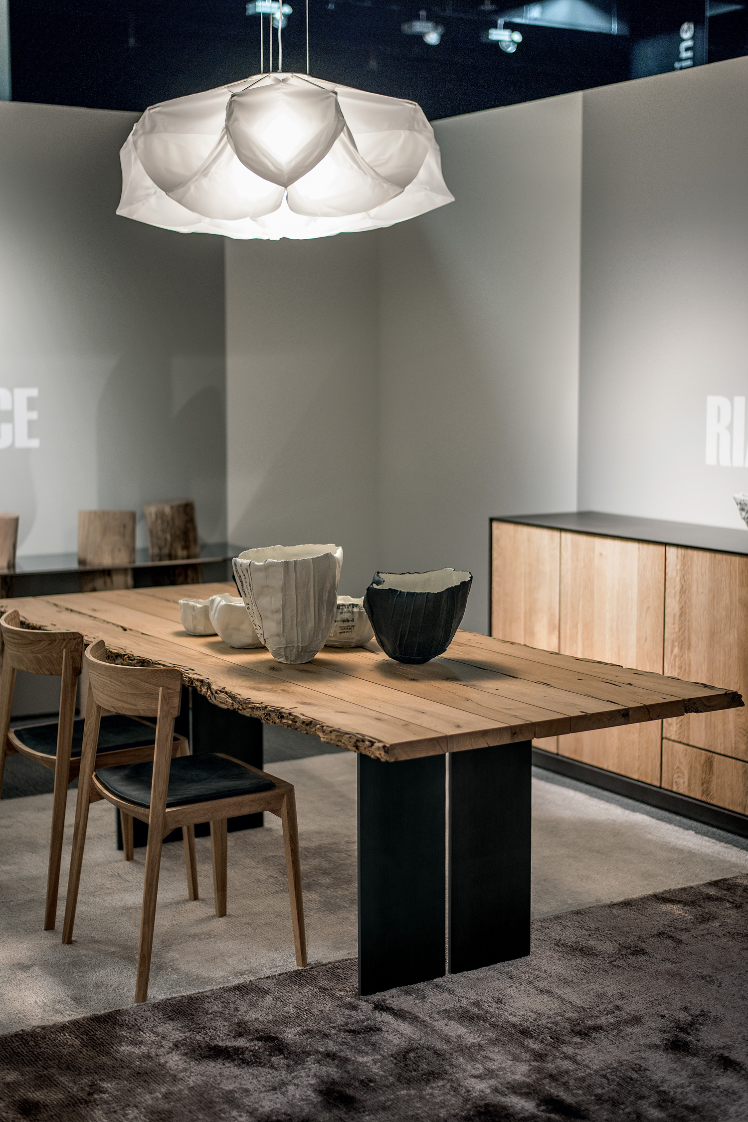 桌子台面由Briccole橡木板制成,非胶粘拼接,桌缘呈自然形态。底座由带中央间隙的铁制桌腿构成。
