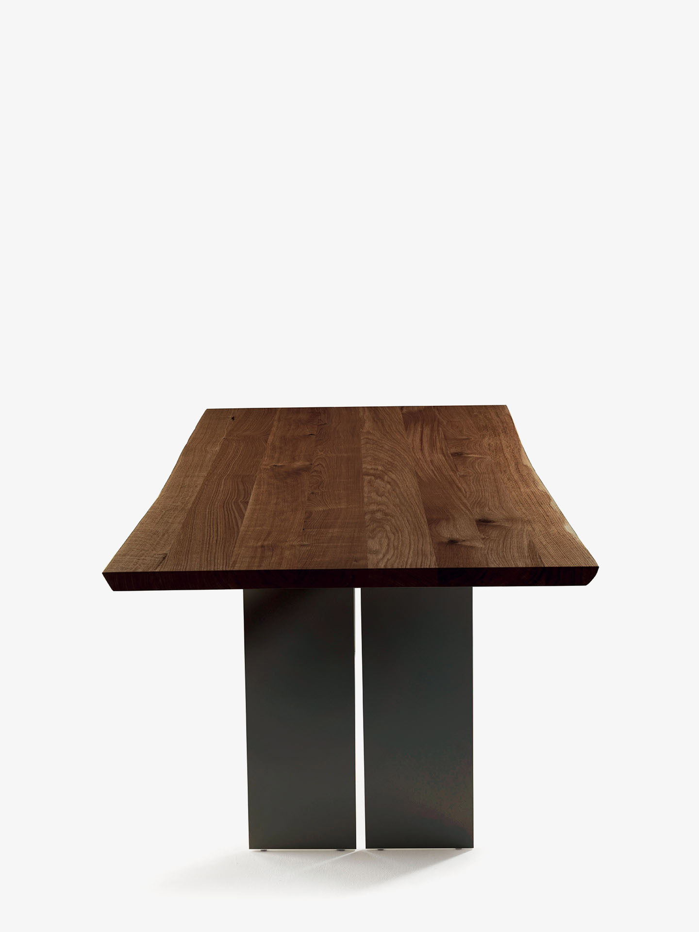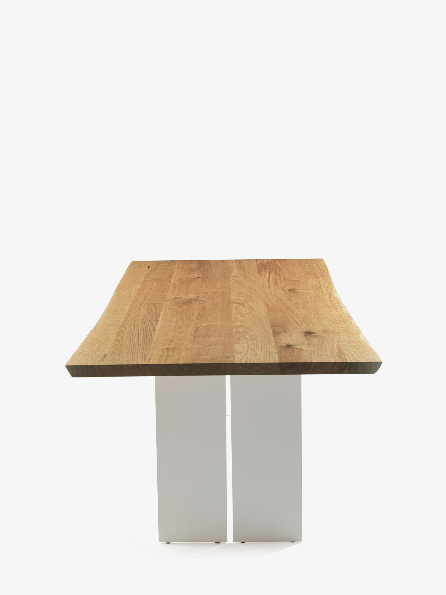 桌子台面由实木木板胶粘拼合而成,桌缘呈自然形态。底座由带中央间隙的铁制桌腿构成。