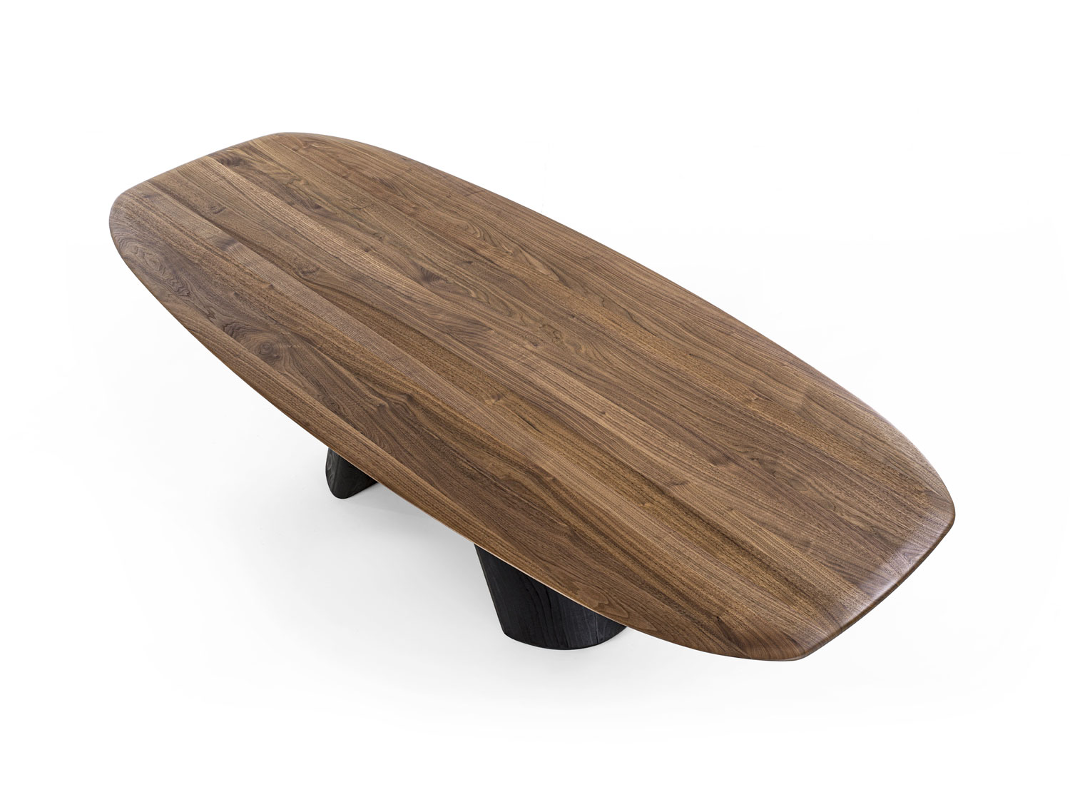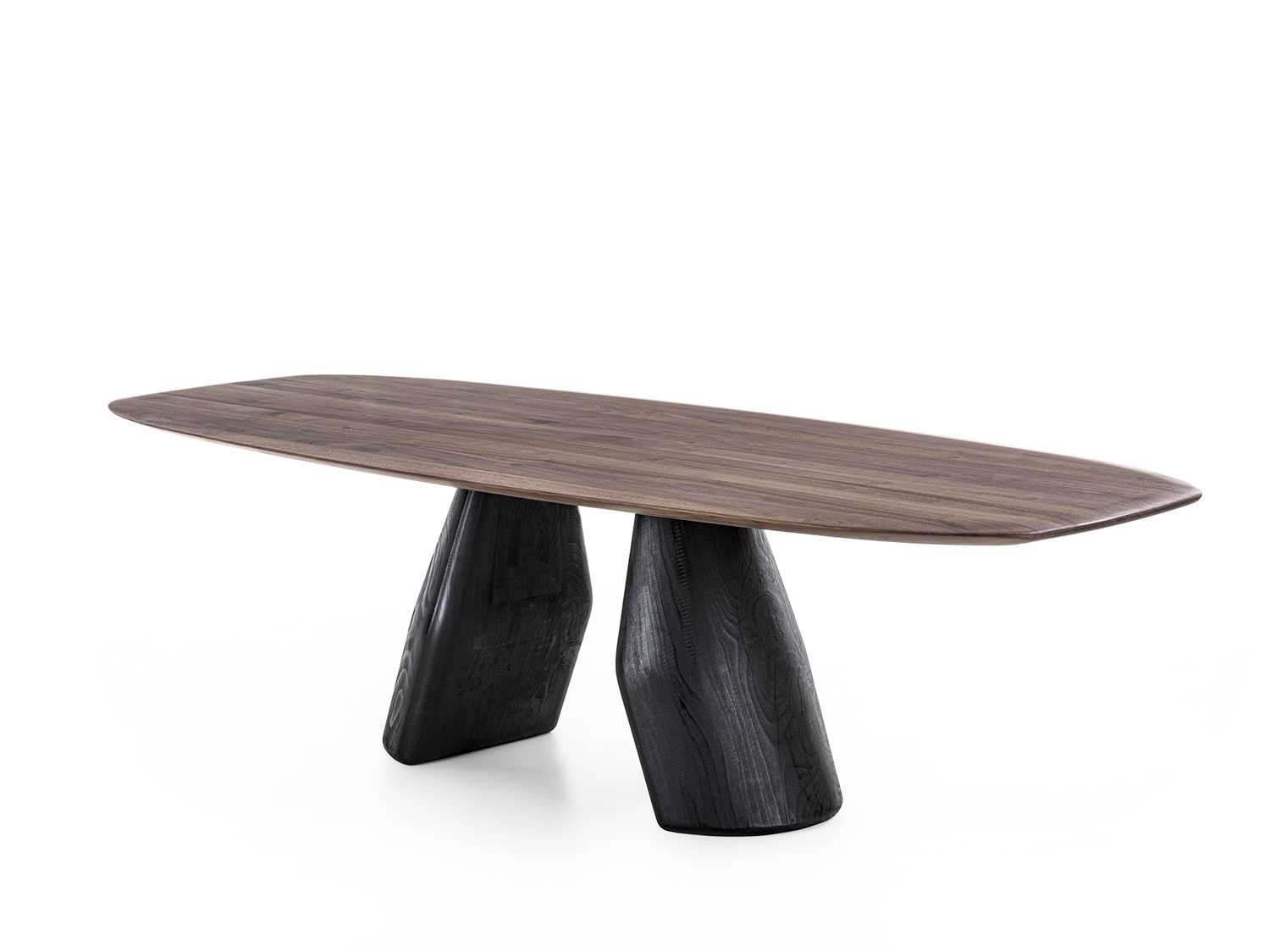 桌面采用实心拼接木粘合,边缘经过倒角处理。其雕塑感十足的桌腿设计体现了两种形态之间的平衡,尽管在视觉上呈现出意想不到的反差,却依然保持着完美的稳定性。