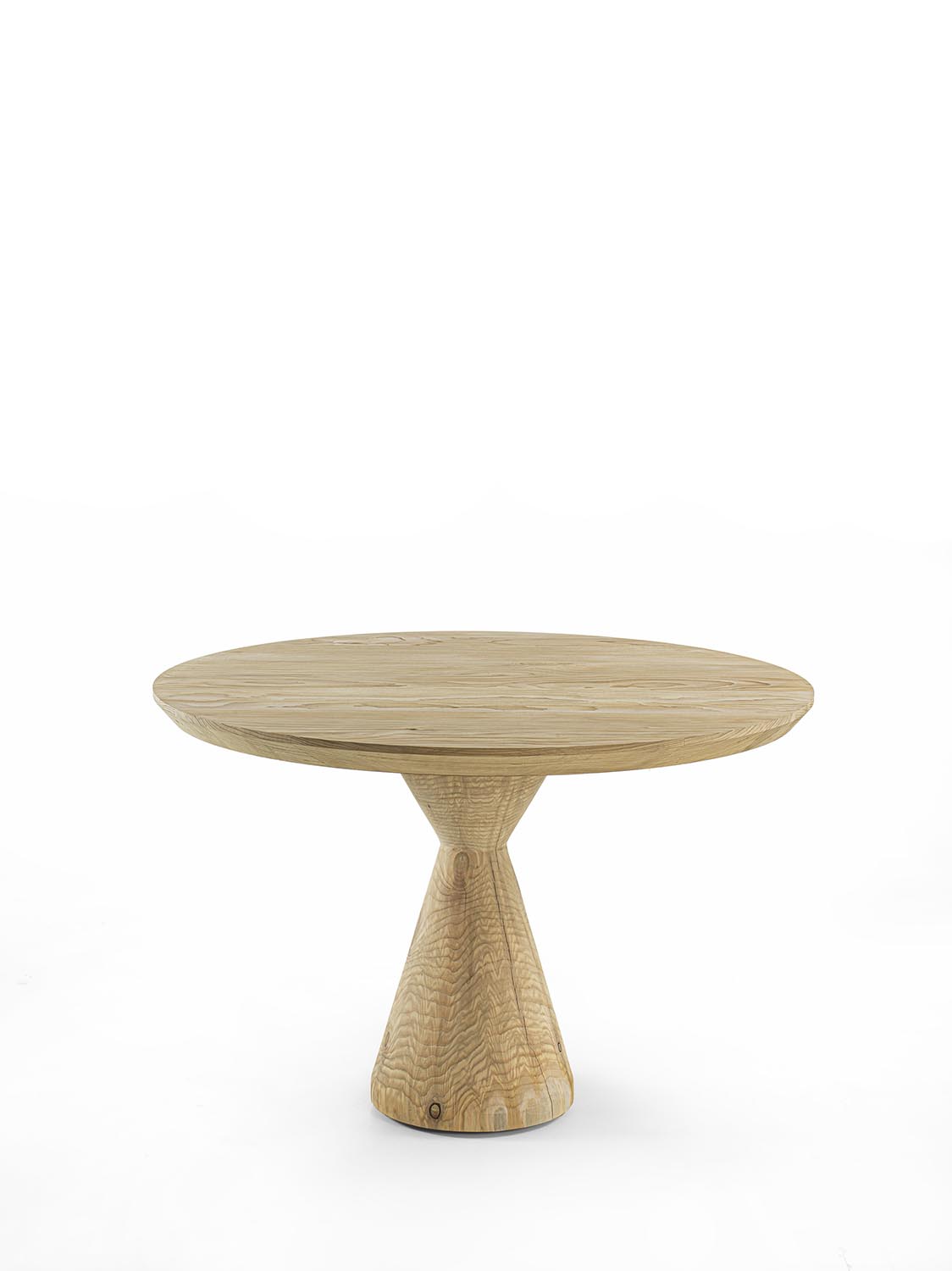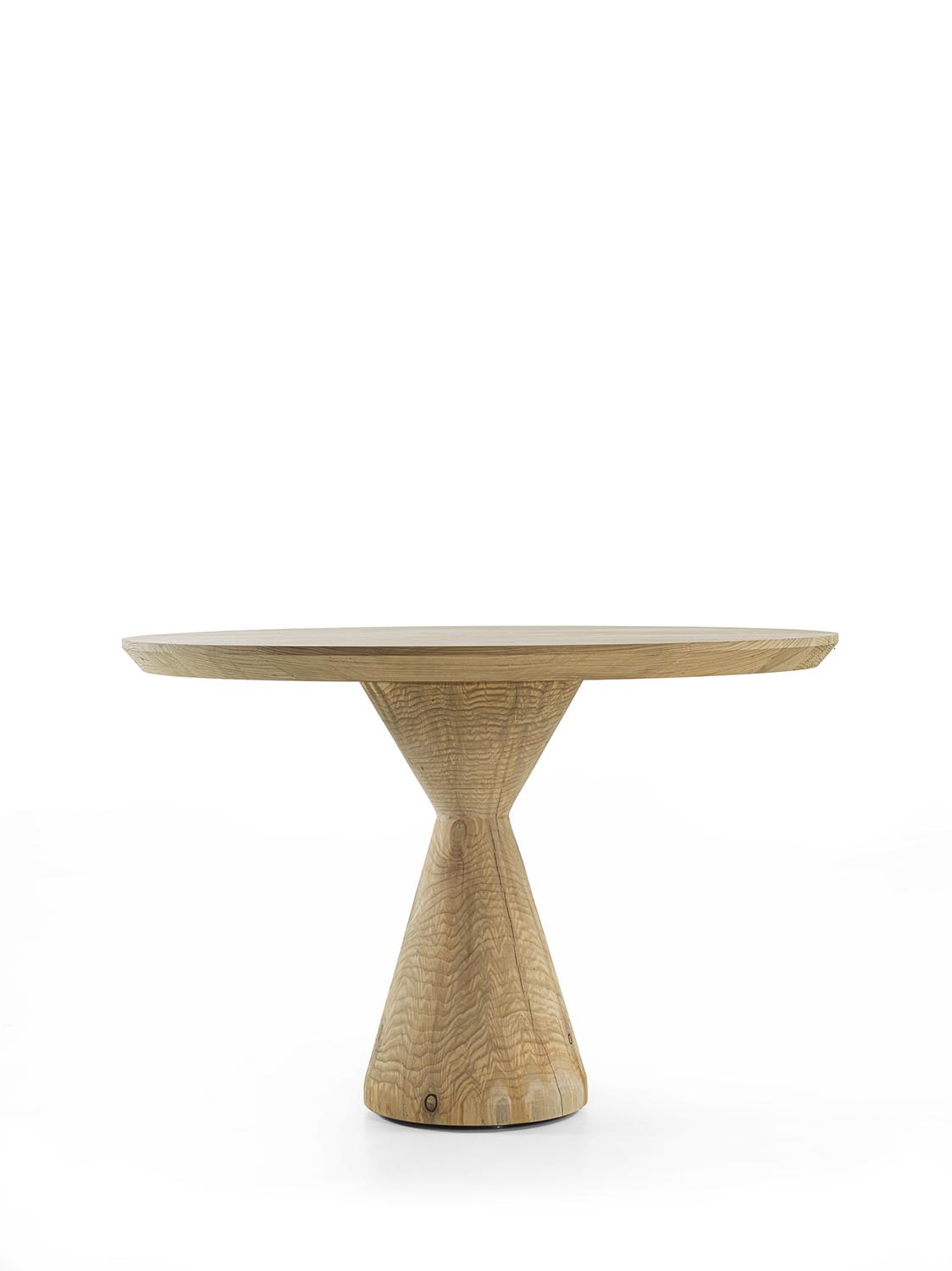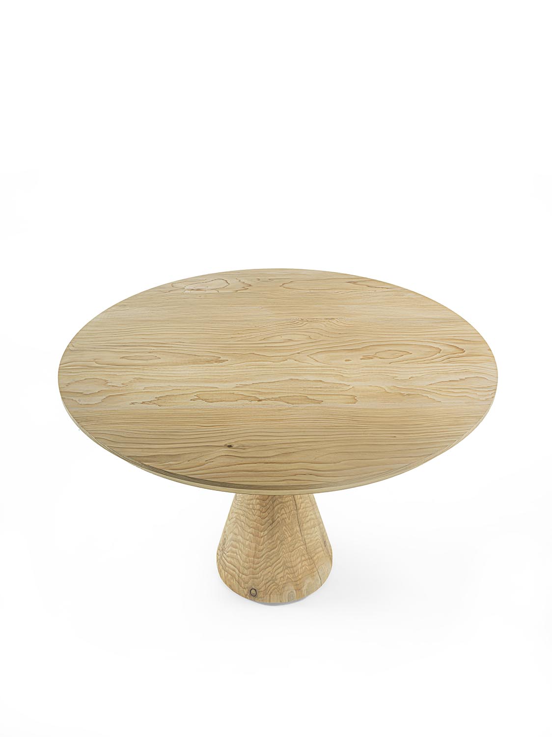 桌子配有由胶合木条制成的雪松实木桌面。底座同样采用整块雪松实木制成,其特点是由两个相互对置、彼此倒置的圆锥构成,由此形成对比交错的视觉效果,塑造出兼具强烈材质感与造型感的雕塑式支撑。