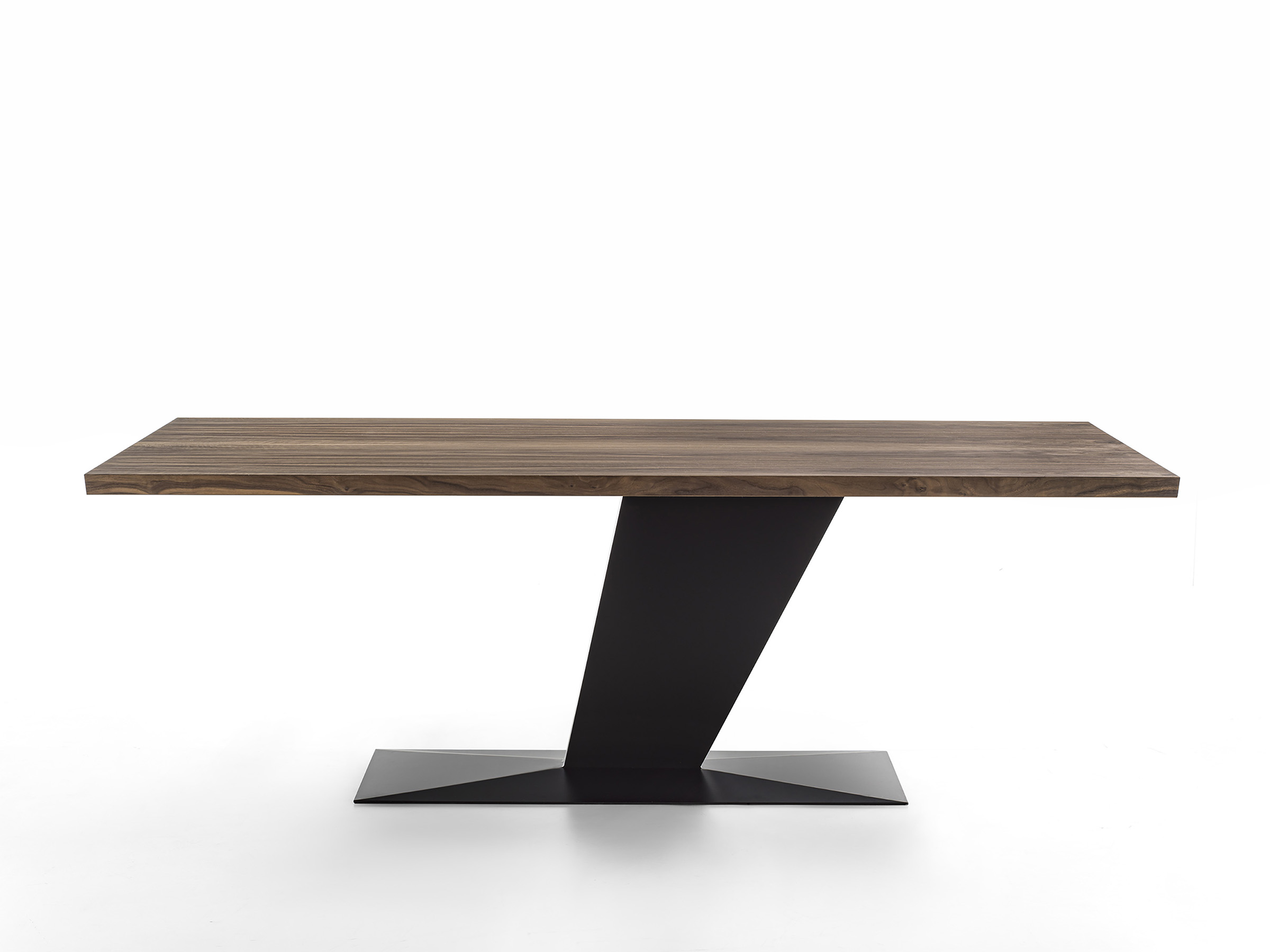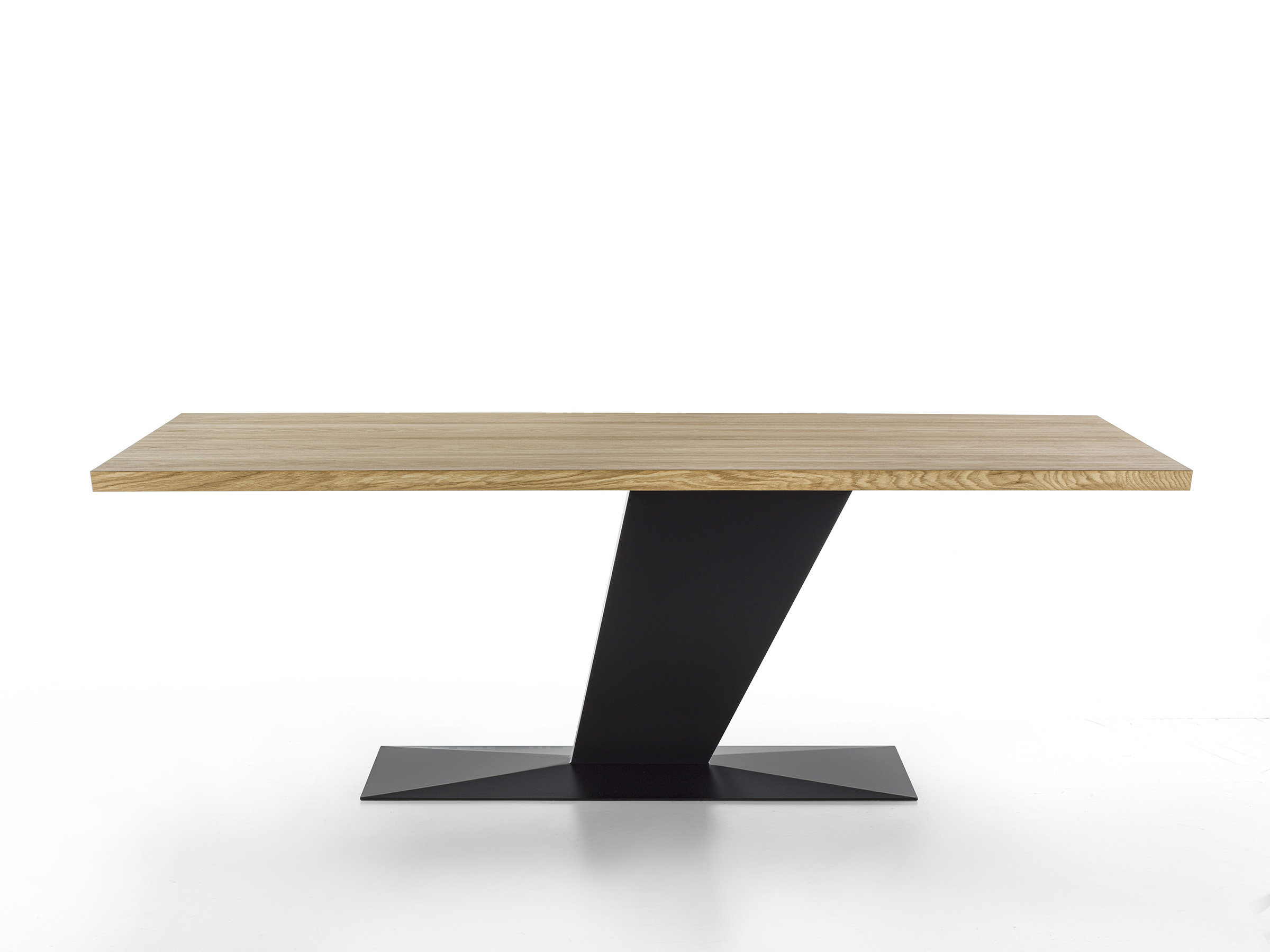 这是一张由粘合的实木板条构成的桌子,搭配一座铁制底座。底座由偏离重心且倾斜的腿构成,侧向放置,并带有地板支撑板。