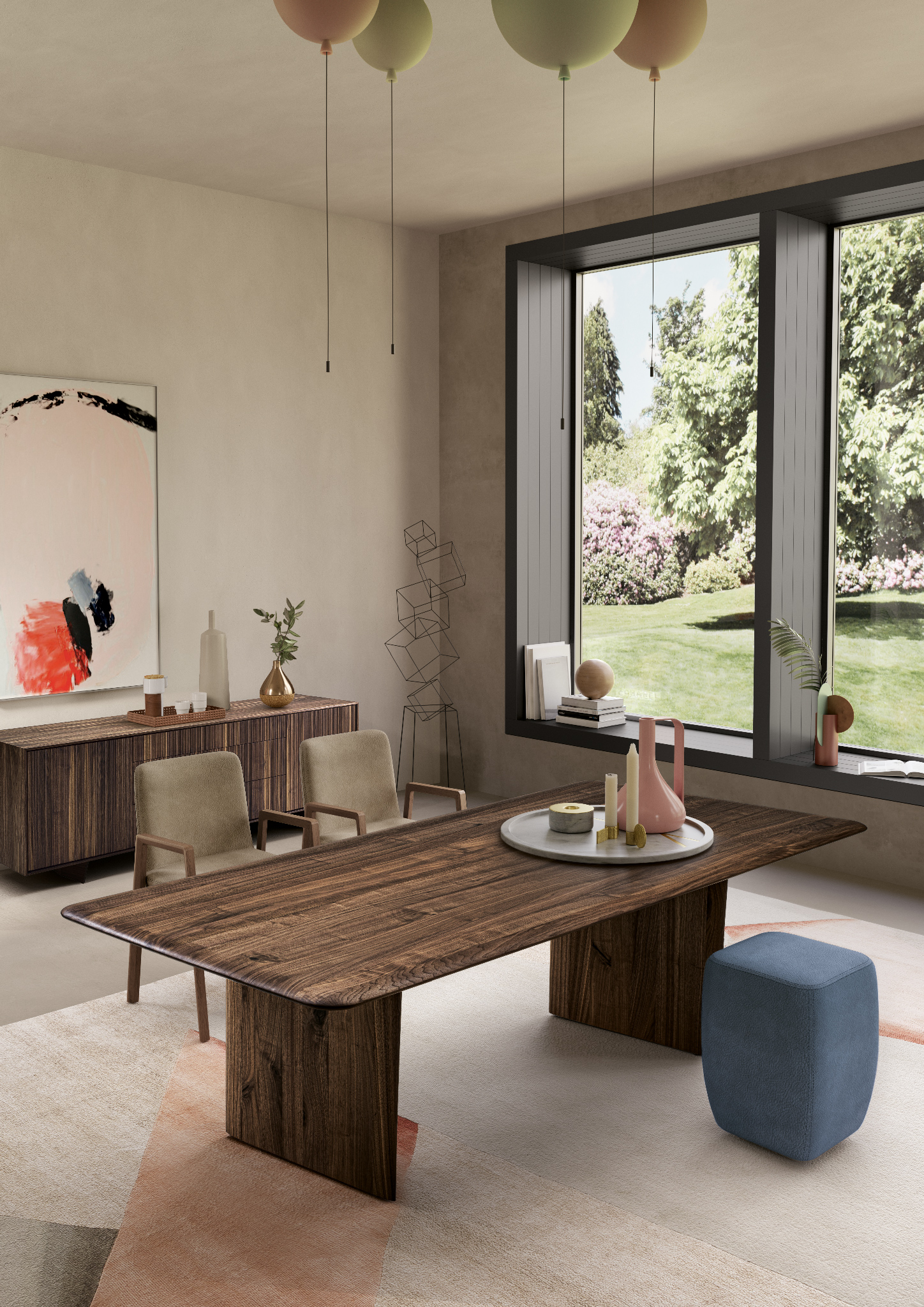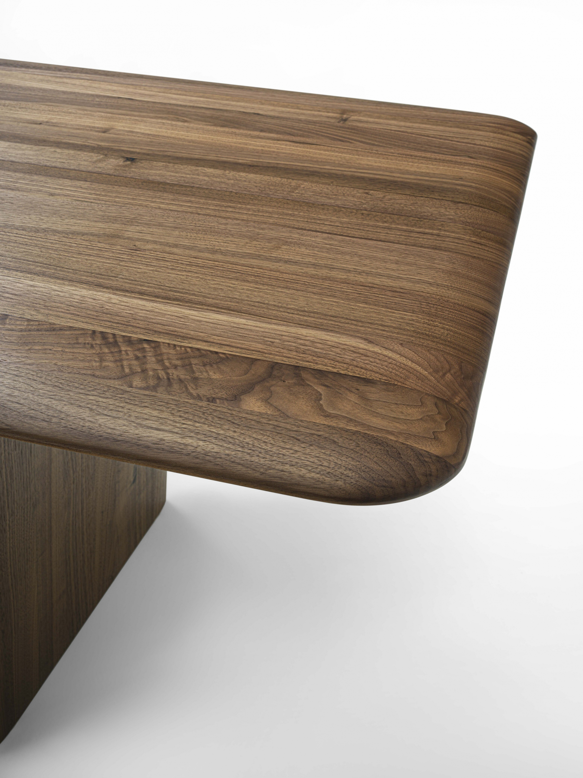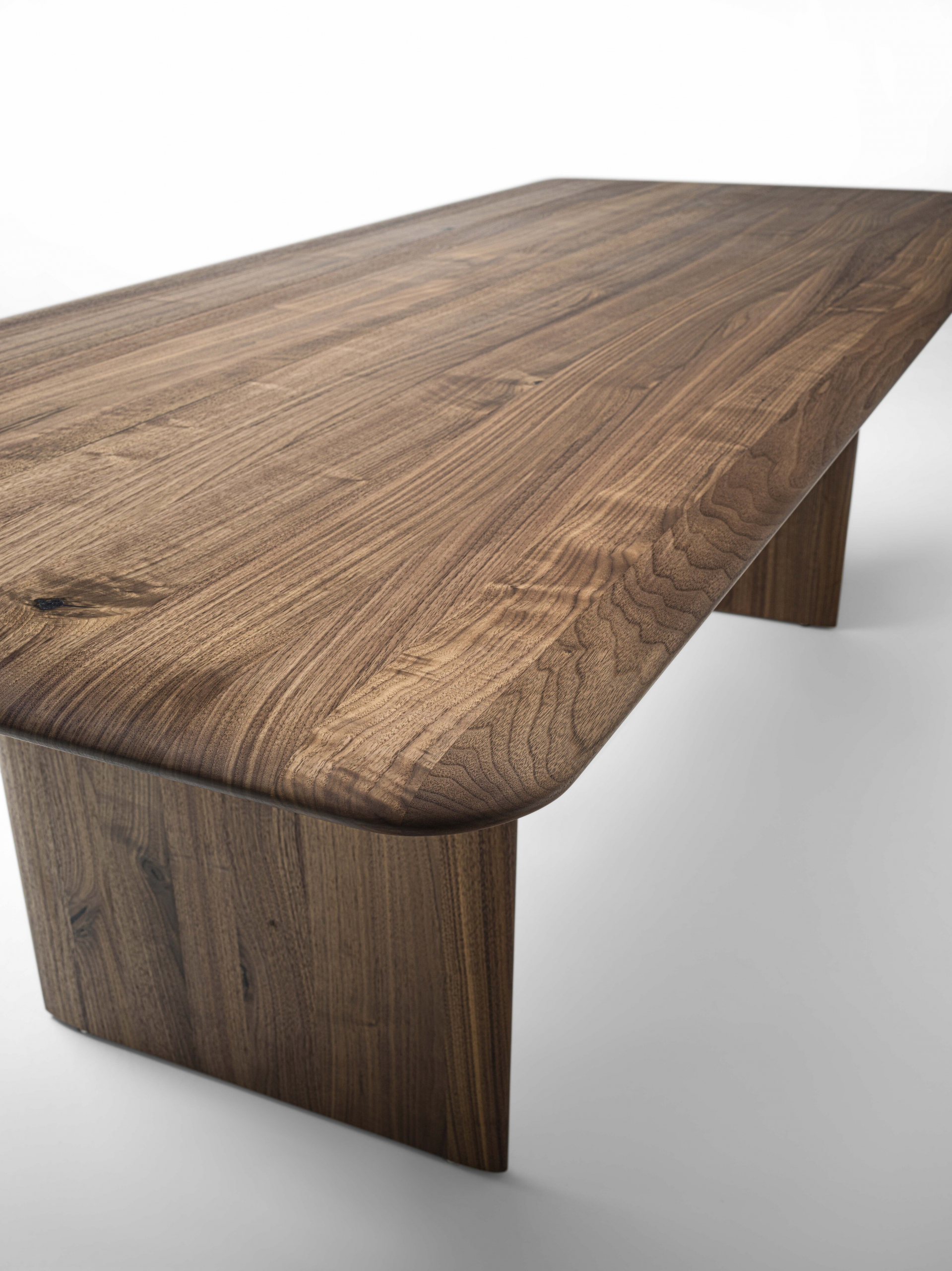 桌子采用实木拼接粘合而成,边缘经过圆角处理。桌面和桌腿均采用削薄处理,赋予其轻盈流畅的曲线美感。