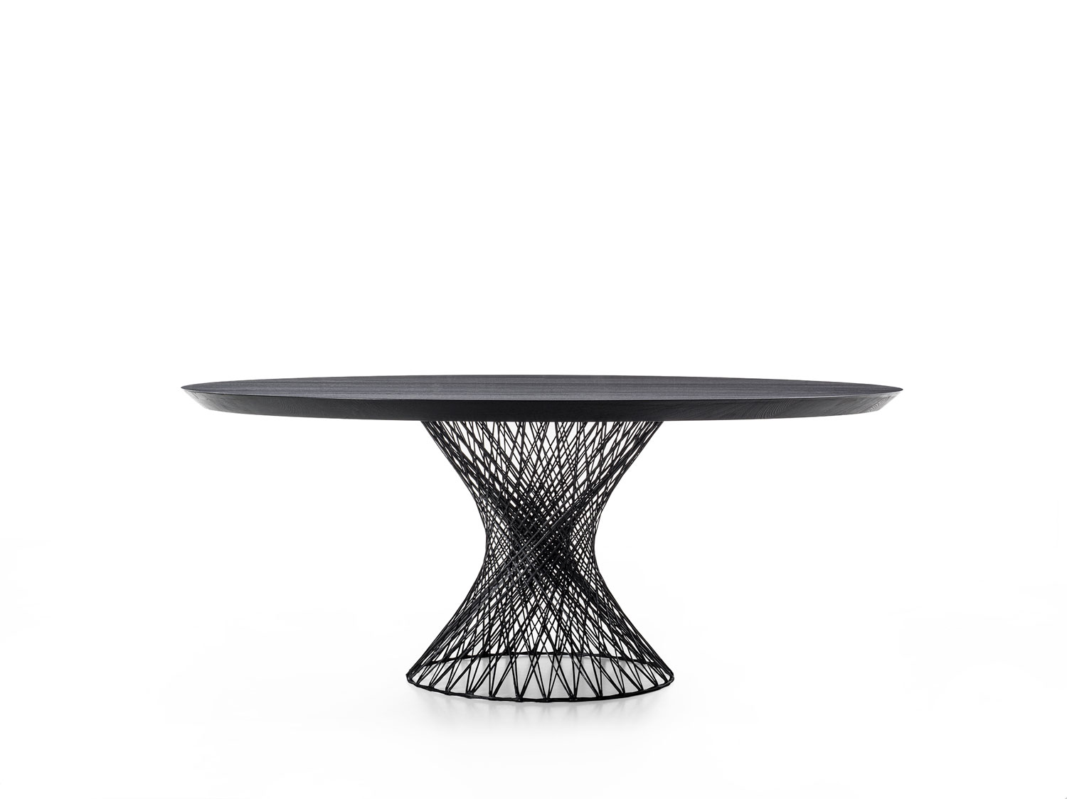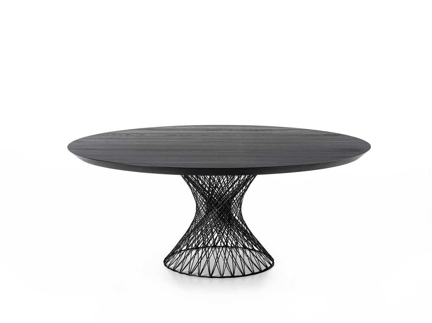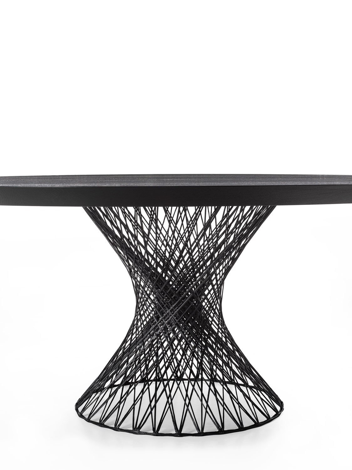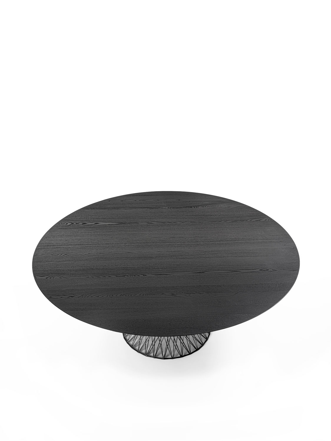 这款圆桌的桌面采用拼接实木打造,搭配编织碳纤维底座支撑。尽管碳纤维材质轻盈,但其底座结构却具备高度承重力,可稳固支撑实木桌面。