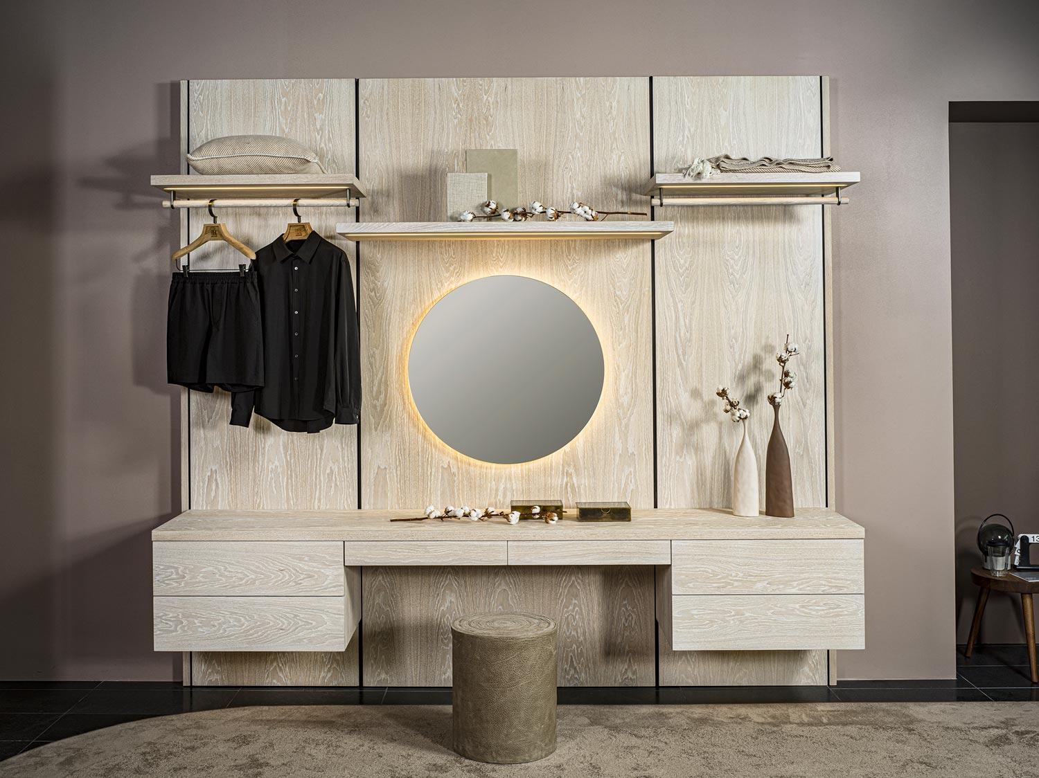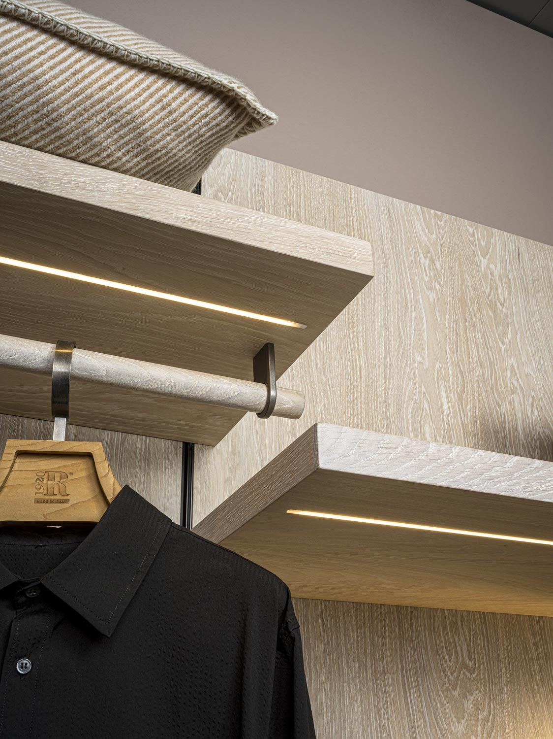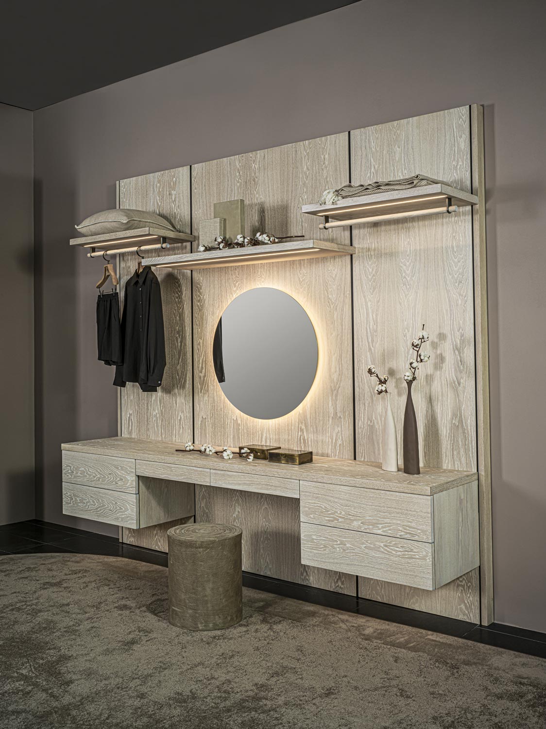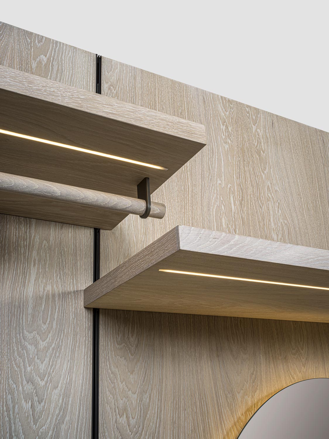 模块化衣柜系统,由镶板构成,可搭配抽屉、置物搁板及挂衣配件等使用。镶板采用贴面拼接板材质制造,亦提供垂直雕刻纹理的 Fresart 工艺版本。搁板同样采用贴面拼接板制成,而抽屉则采用传统的燕尾榫结构。该系统还可集成 LED 灯带与镜面。另可根据图纸定制个性化衣柜组件。
