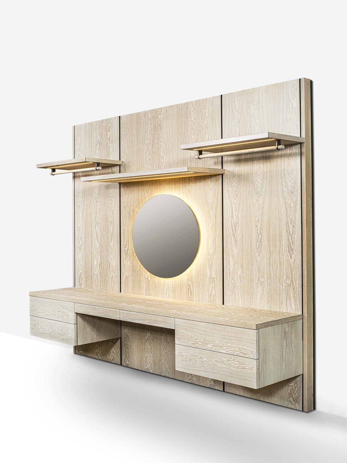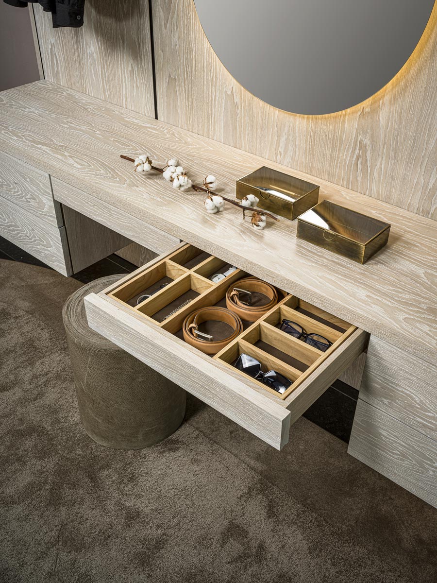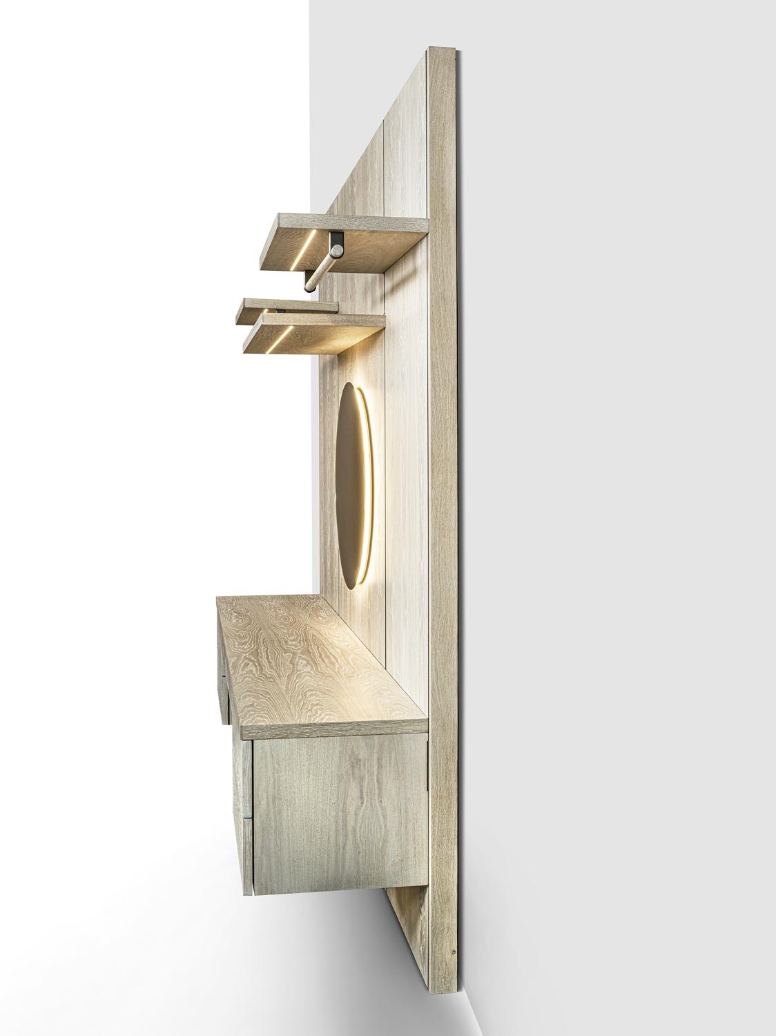 模块化衣柜系统,由镶板构成,可搭配抽屉、置物搁板及挂衣配件等使用。镶板采用贴面拼接板材质制造,亦提供垂直雕刻纹理的 Fresart 工艺版本。搁板同样采用贴面拼接板制成,而抽屉则采用传统的燕尾榫结构。该系统还可集成 LED 灯带与镜面。另可根据图纸定制个性化衣柜组件。