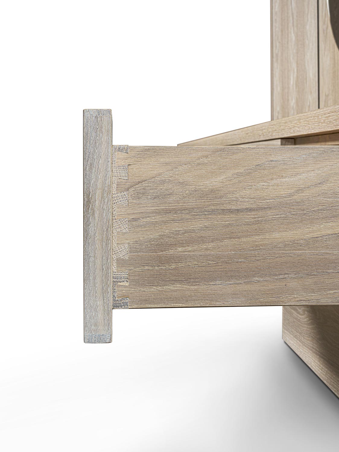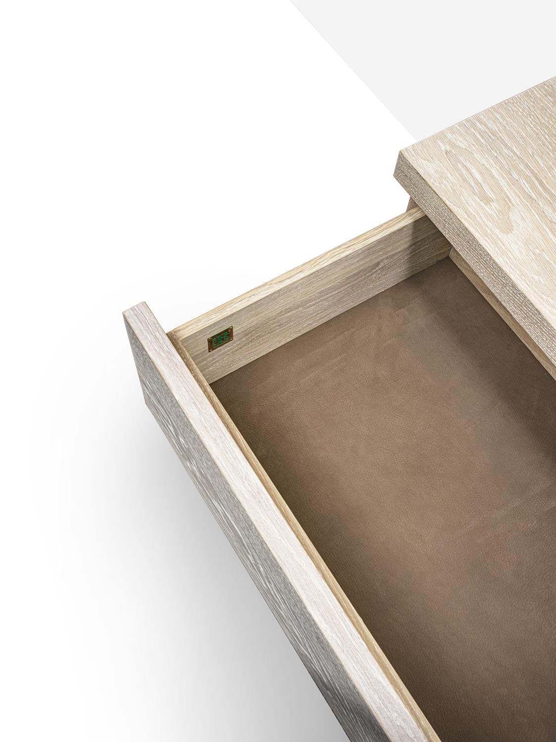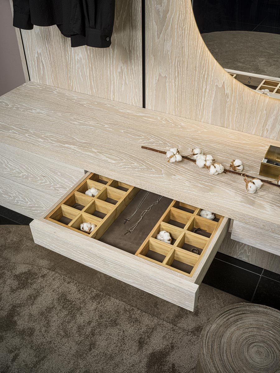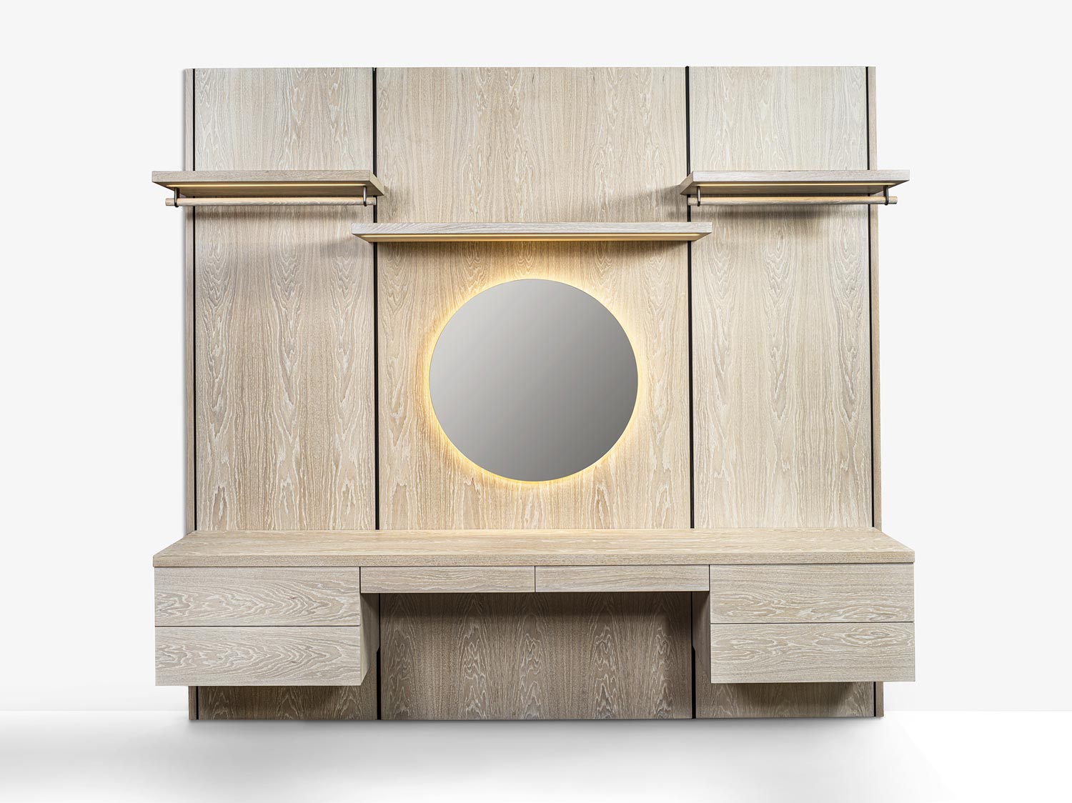 模块化衣柜系统,由镶板构成,可搭配抽屉、置物搁板及挂衣配件等使用。镶板采用贴面拼接板材质制造,亦提供垂直雕刻纹理的 Fresart 工艺版本。搁板同样采用贴面拼接板制成,而抽屉则采用传统的燕尾榫结构。该系统还可集成 LED 灯带与镜面。另可根据图纸定制个性化衣柜组件。