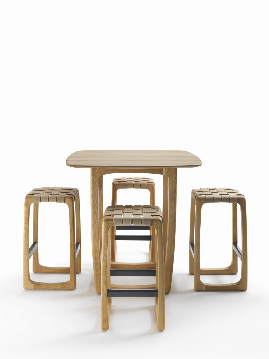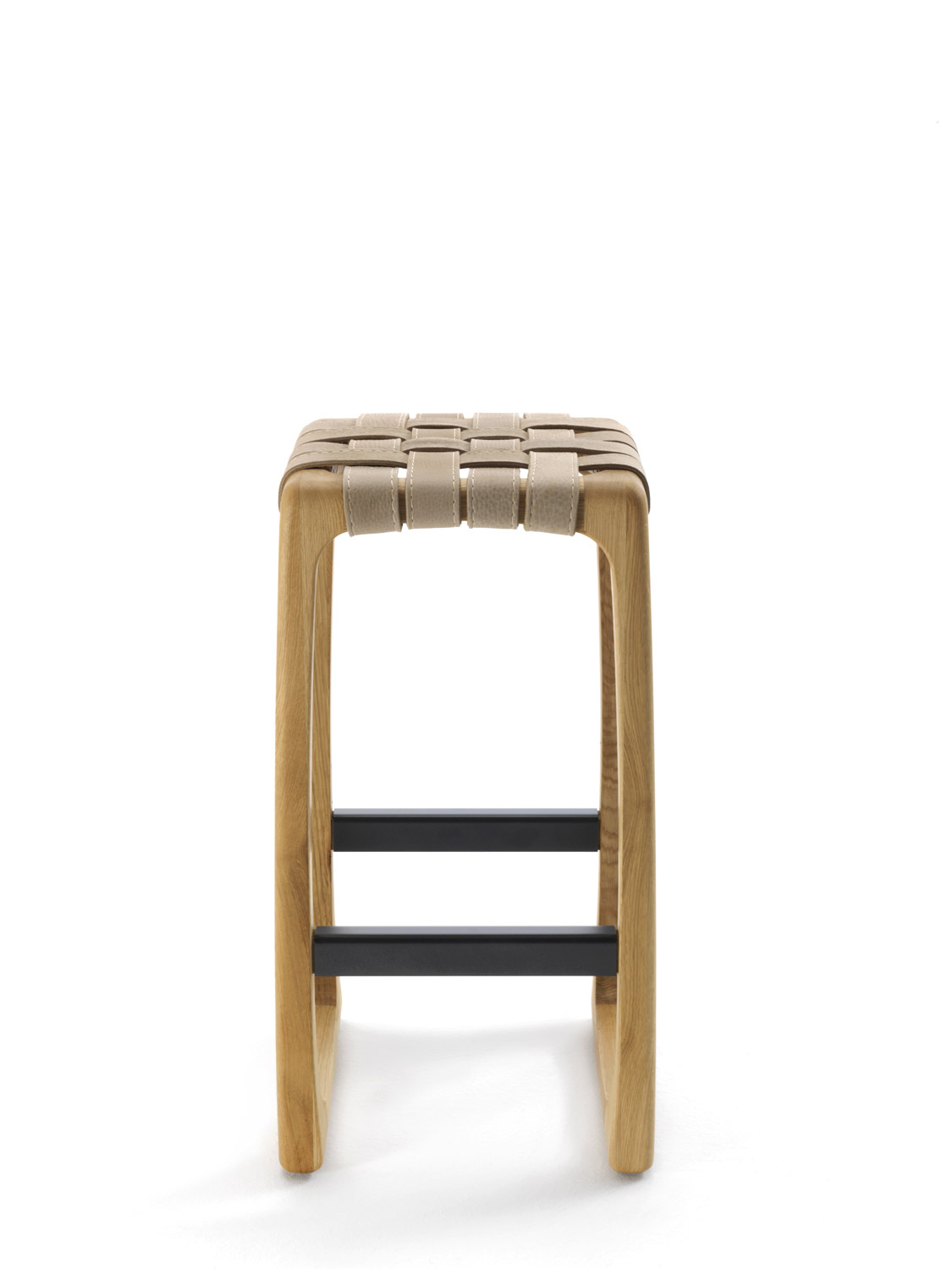 吧凳采用实木结构,全手工制作、组装、打磨,并设有两个实用的铁制脚搭。椅座由皮革带或织物带编织而成。当编织带为织物时,其内部有结构性支撑。