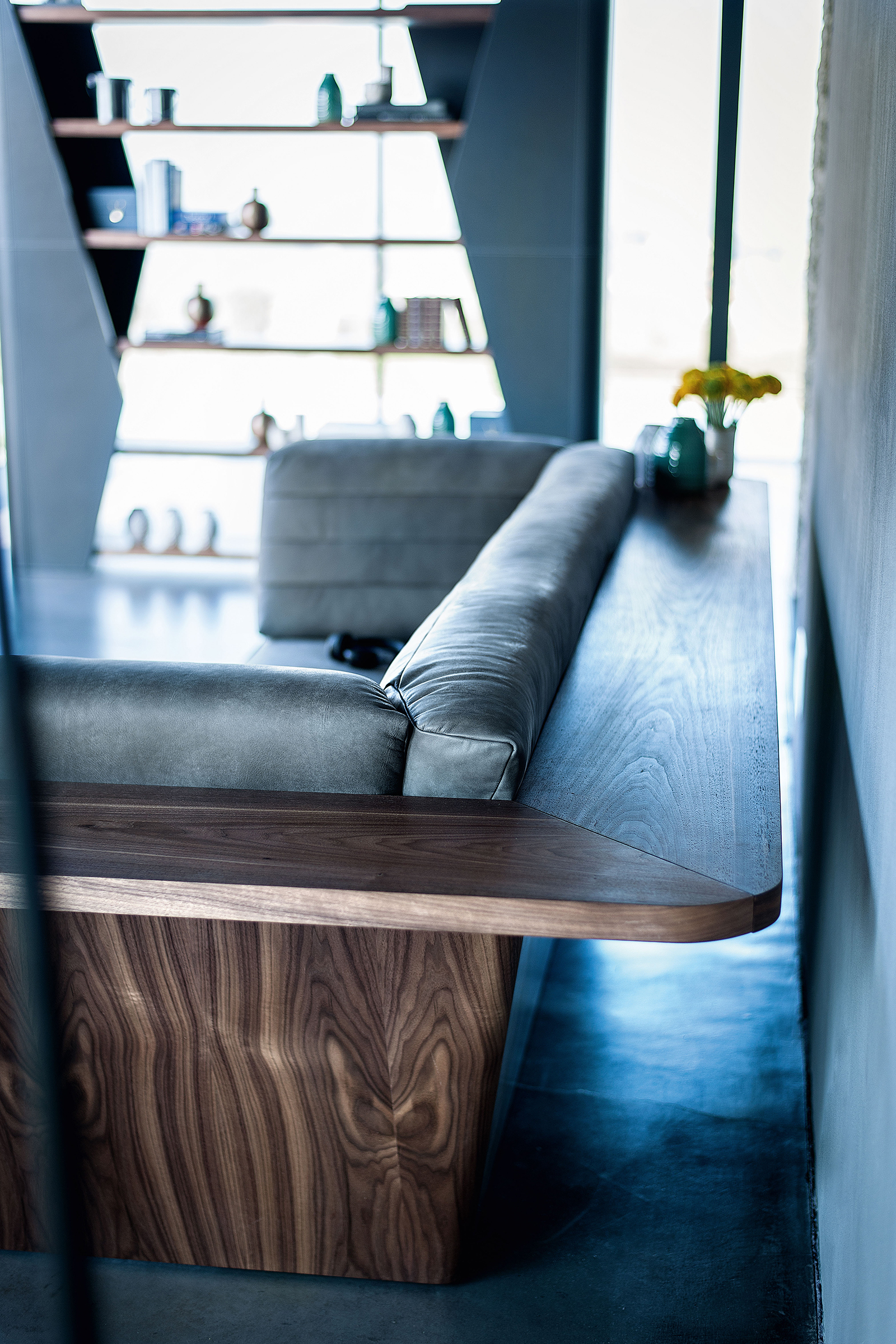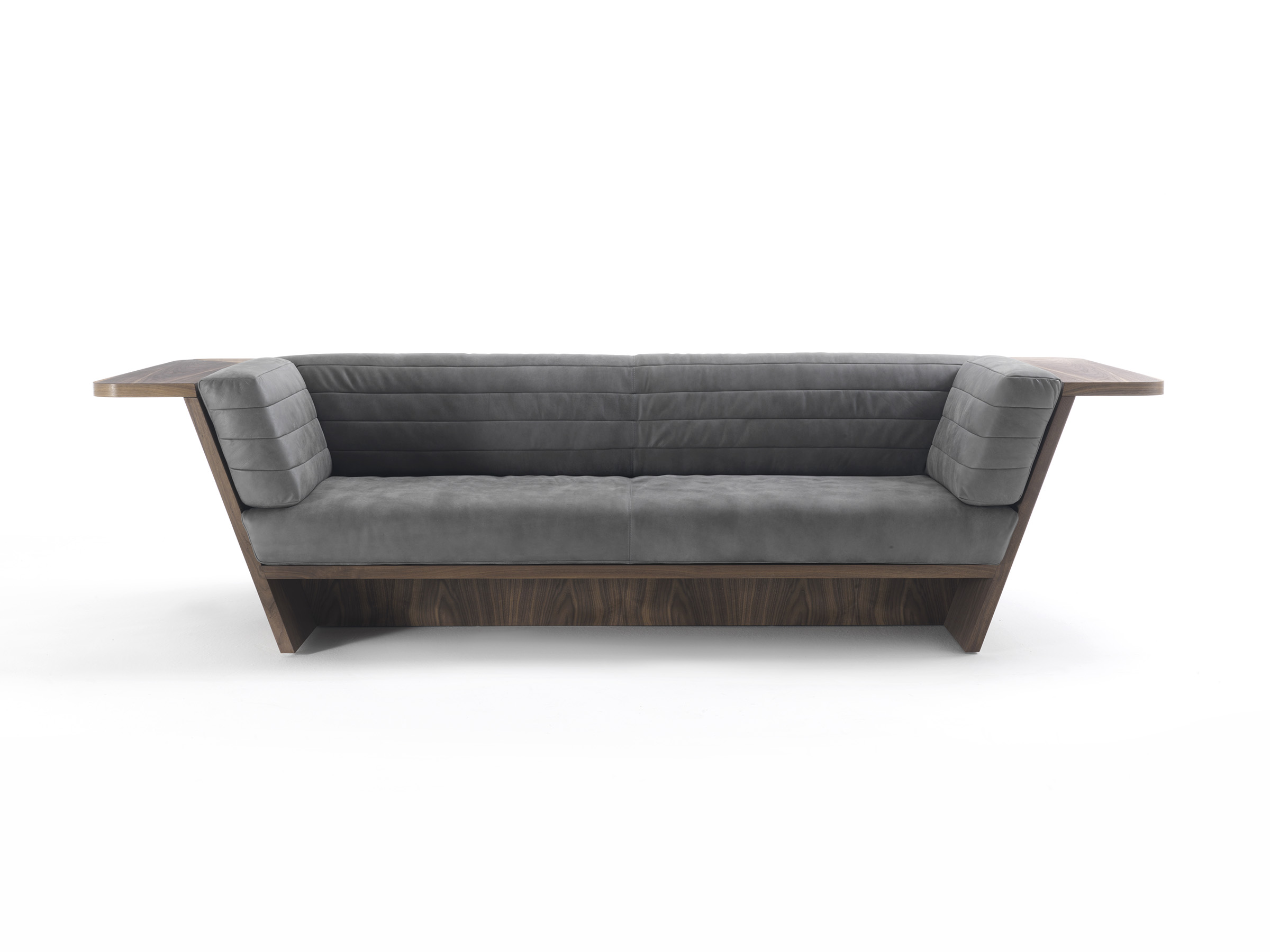 Диван с деревянным каркасом с полкой, проходящей по всему периметру. Совместные подушки сиденья и спинки с видимой строчкой.