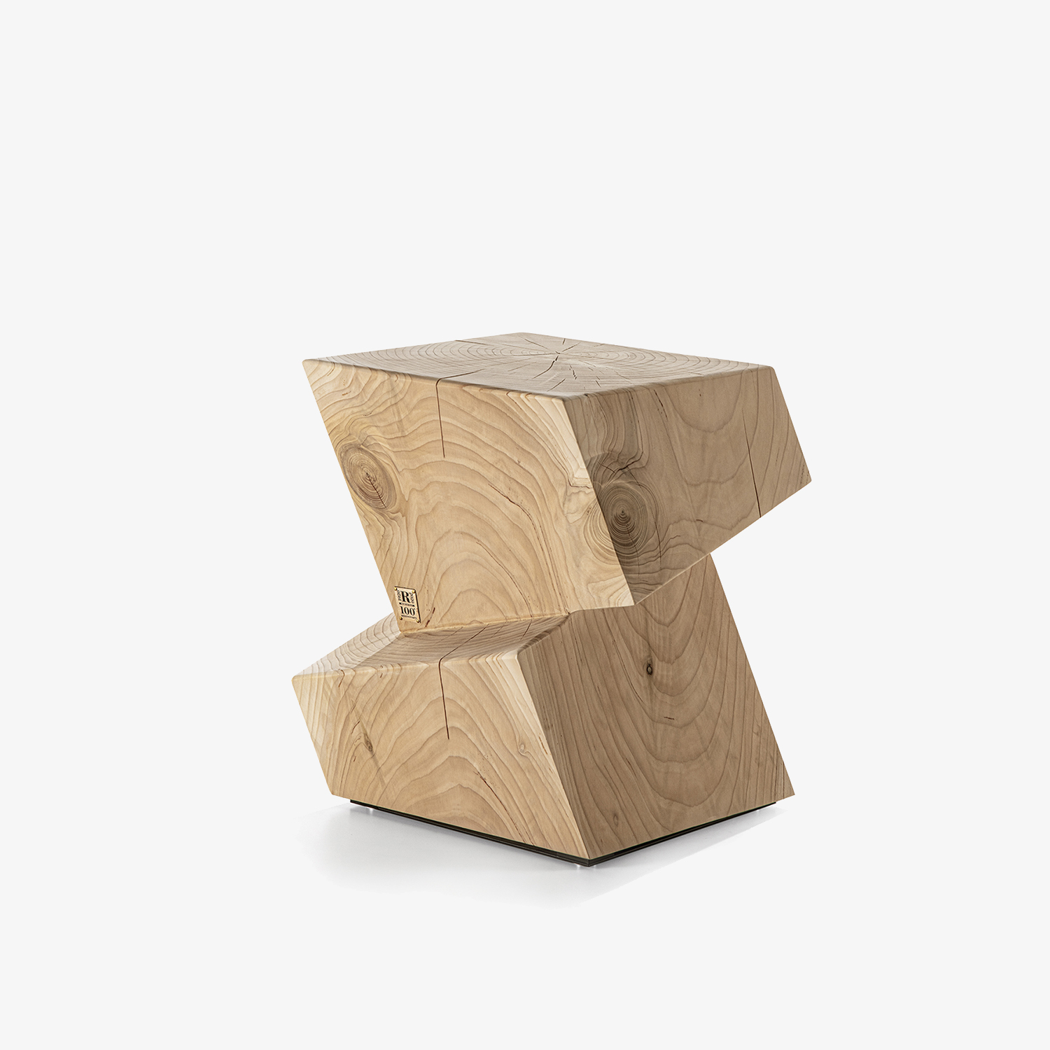 Дизайнерская табуретка из цельного блока массива душистого кедра, форма которой - дань кубическим домам голландского архитектора Пита Блома. В высокой версии выступающий нижний элемент выполняет функцию подставки для ног.