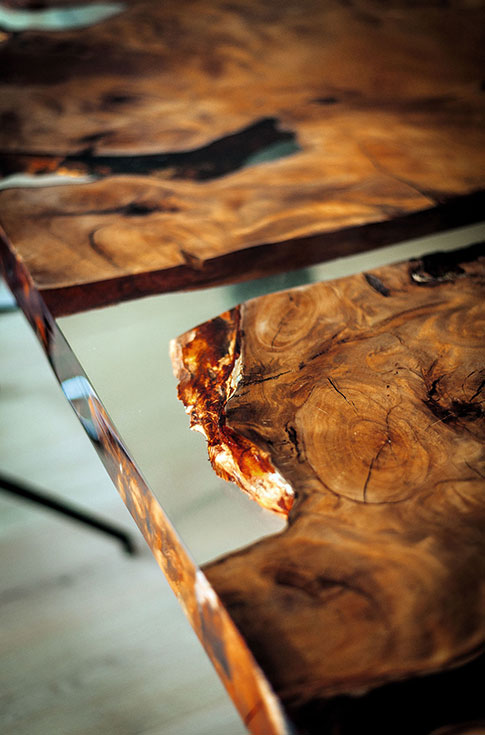 原始板材可结合树脂进行处理。这一工艺精细而缓慢,通过填补木材天然形成的孔洞与空腔,并对边缘进行找平,使木材宛如被封存于一层通透的透明框体之中。随后,工匠以手工反复打磨台面,使其表面获得均匀而细腻的触感;最后,再以天然植物油进行饰面处理,充分呈现贝壳杉独有的纹理之美与温润质感。Riva1920 在中文材料说明中也将其饰面表述为以植物油、蜂蜡等为基础的天然处理体系。