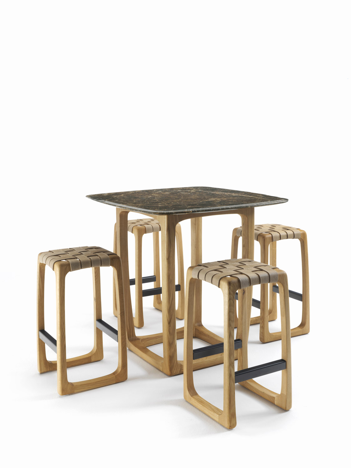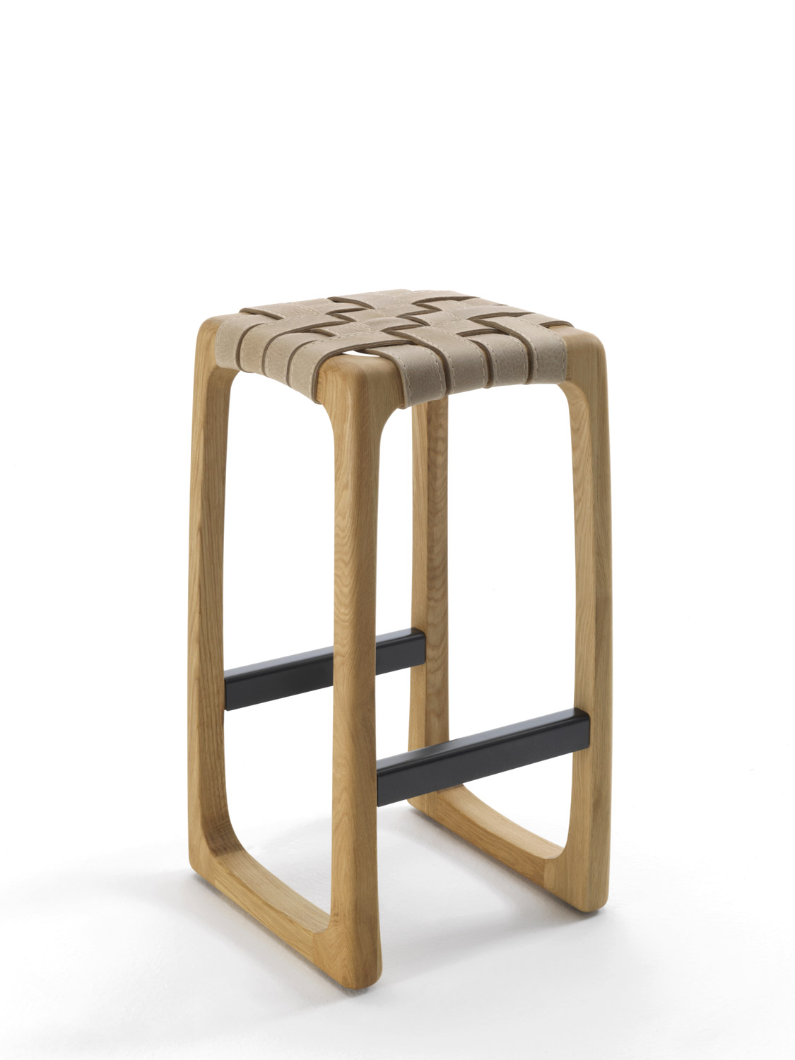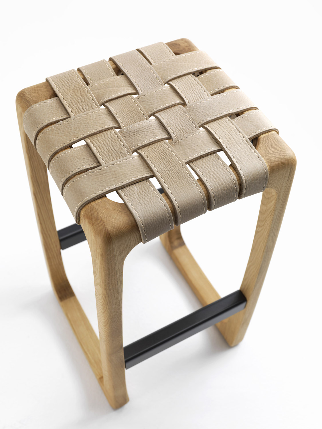 吧凳采用实木结构,全手工制作、组装、打磨,并设有两个实用的铁制脚搭。椅座由皮革带或织物带编织而成。当编织带为织物时,其内部有结构性支撑。