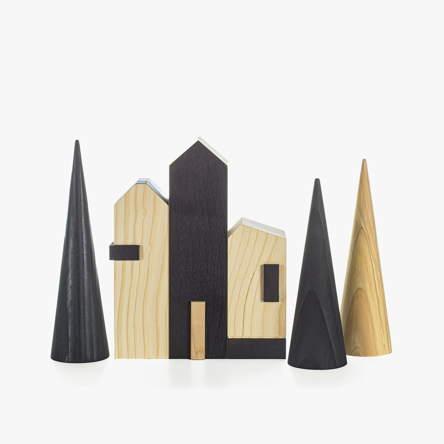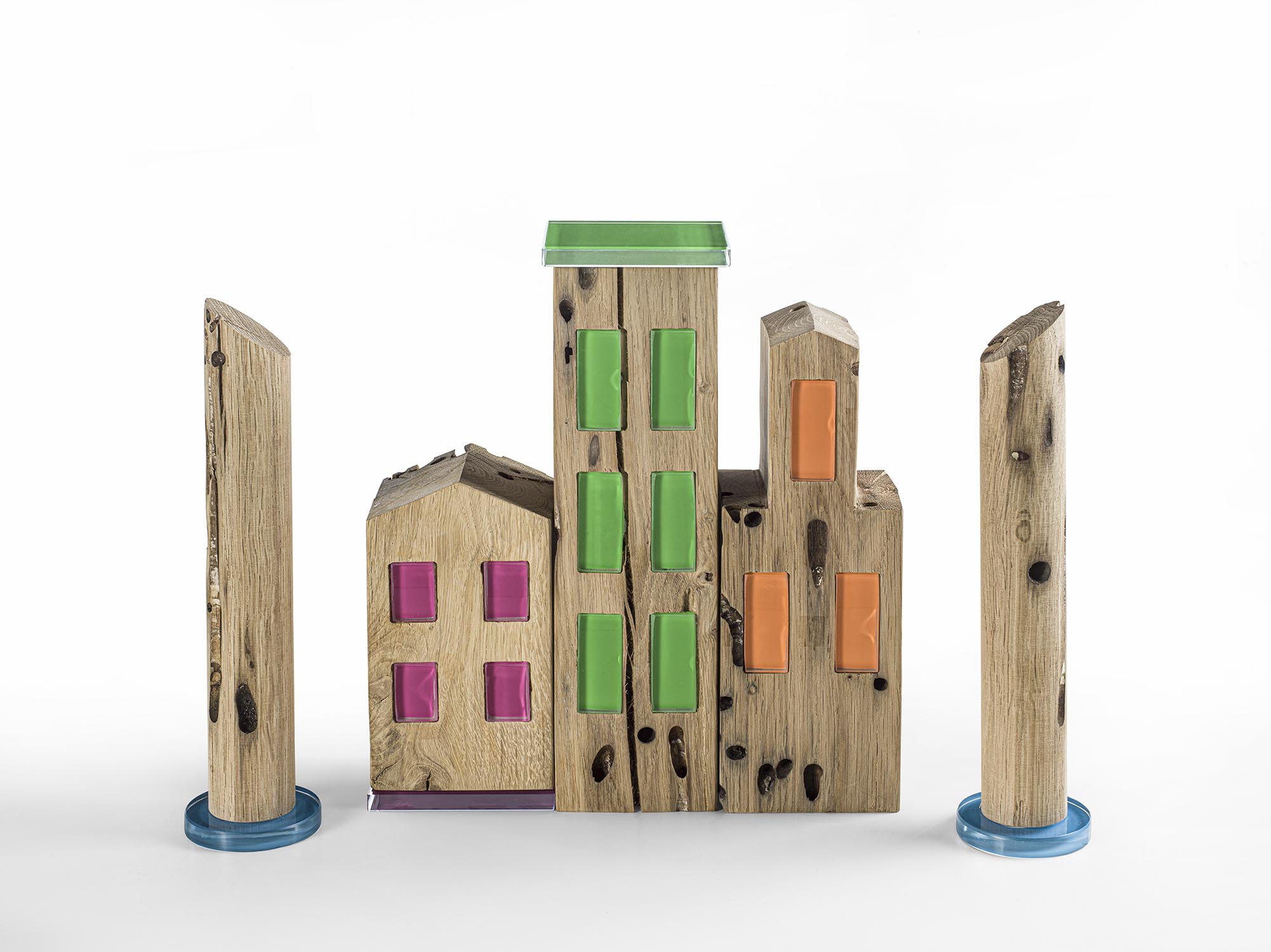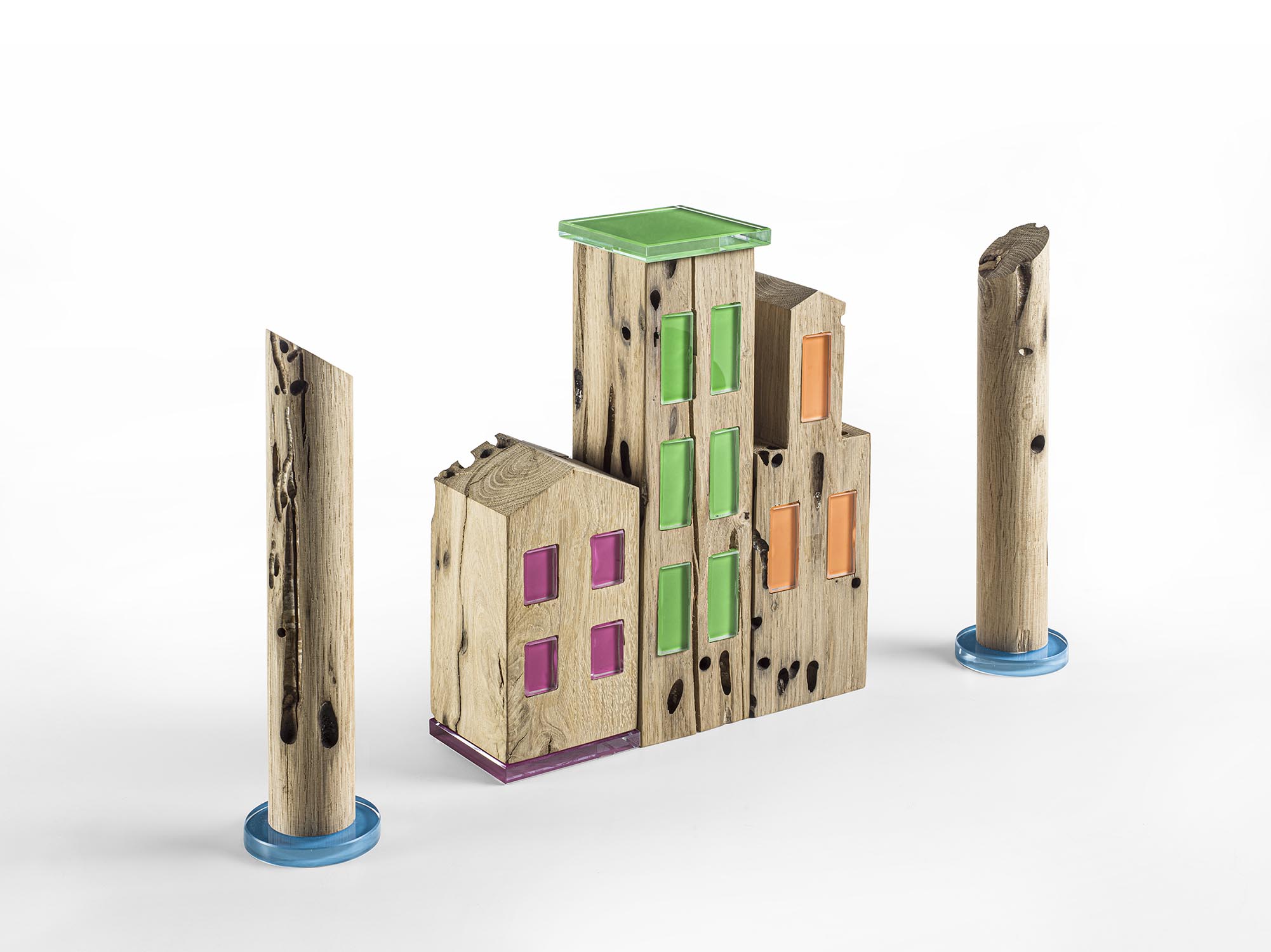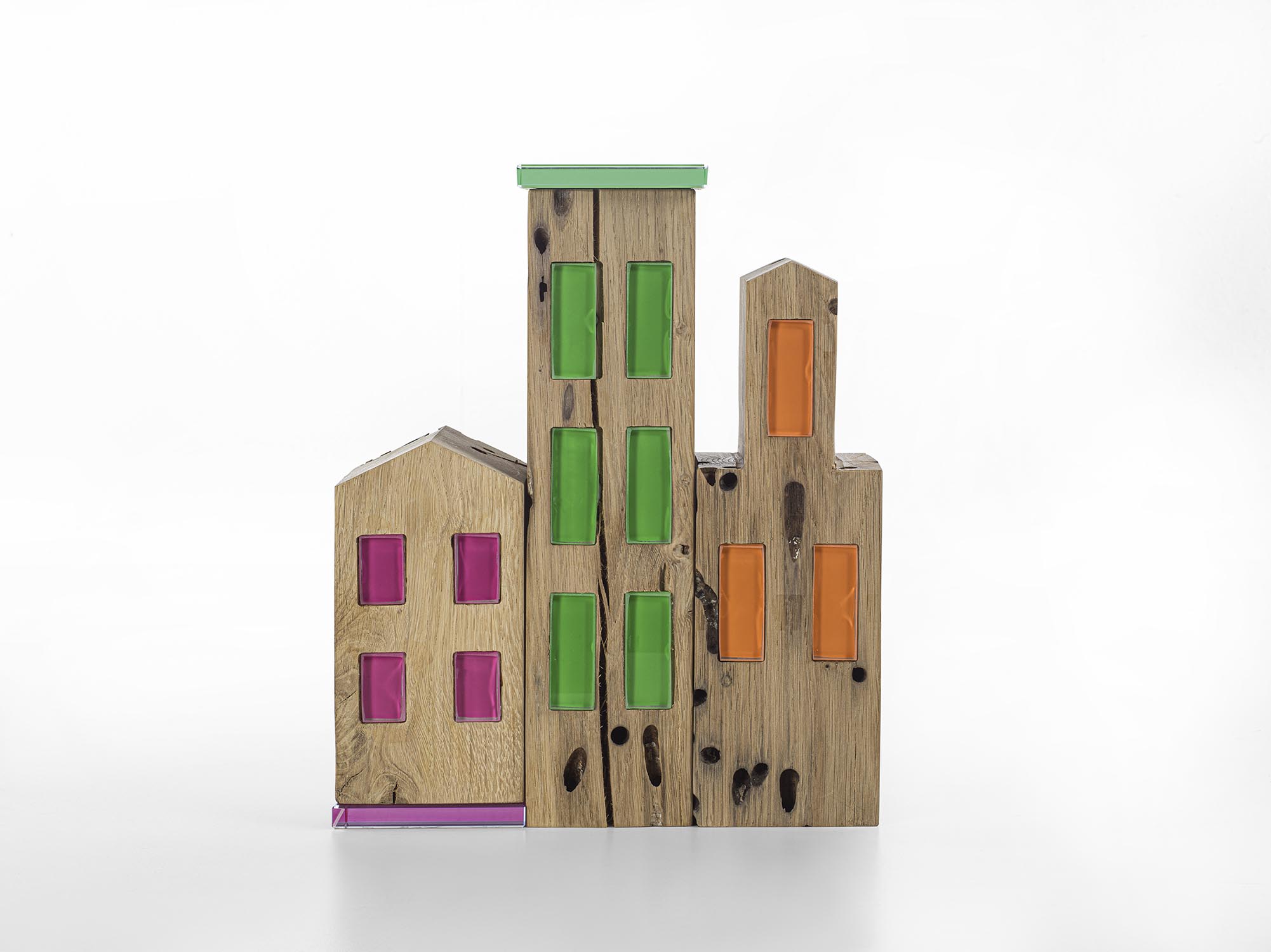 由象征威尼斯传统的 Briccola 木桩打造的五件家居陈设品组合。该系列包括三座造型与高度互不相同的小屋(名为CÀ_1、CÀ_2和CÀ_3),并饰以彩色烤漆玻璃嵌件,营造优雅的材质对比。