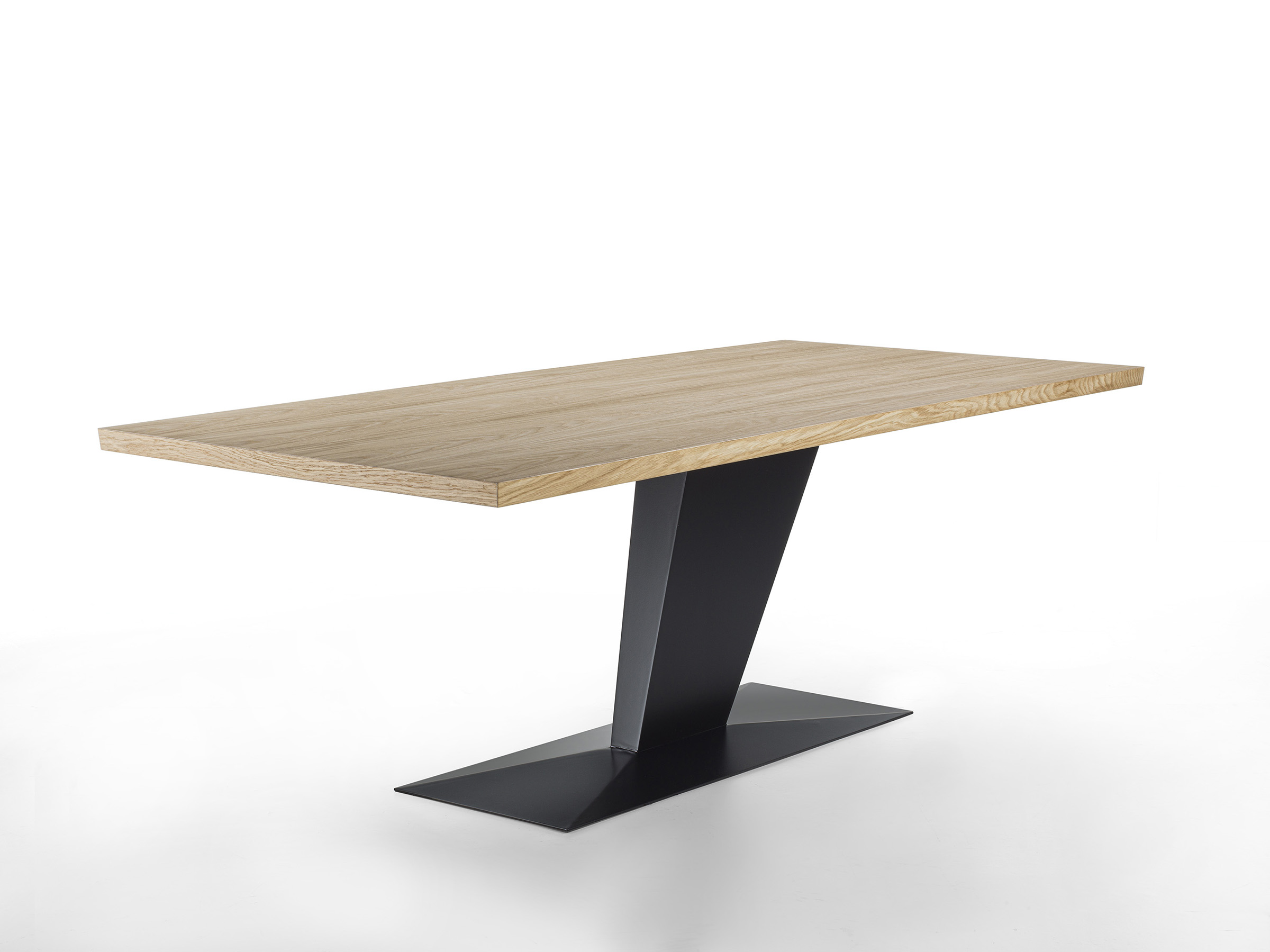 桌面完全采用实心细木工板铺设。底座由离心倾斜的铁腿和面板组成。