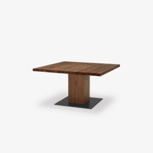 全实木桌子,台面为正方形形状。中央桌腿由木板胶粘拼接而成,采用空心结构,带铁制底板。